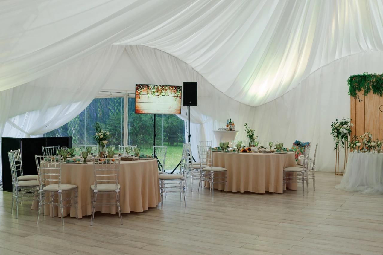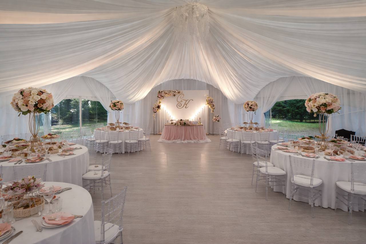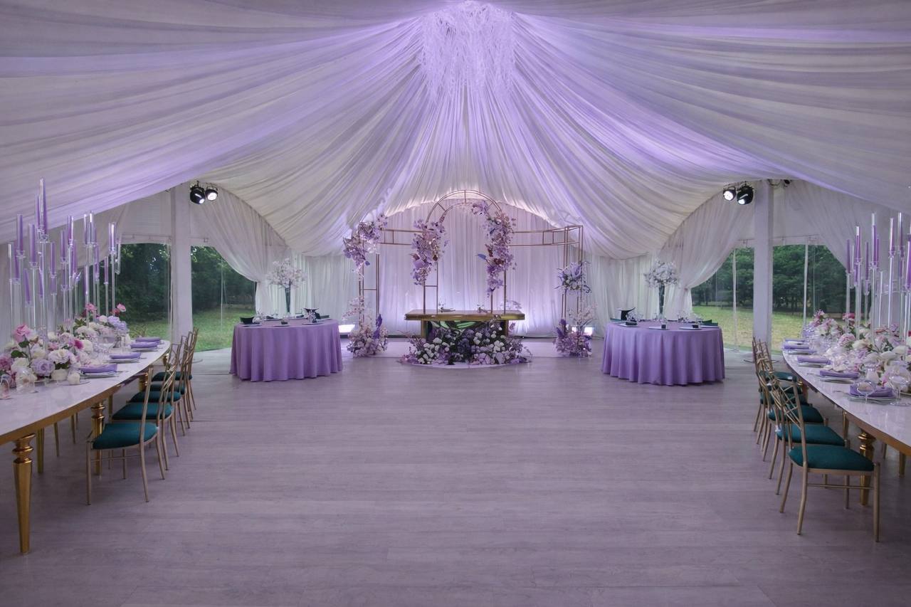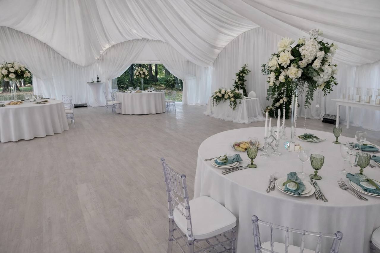 Шатёр расположен на территории исторической усадьбы — одного из самых живописных дворцово-парковых ансамблей Москвы, что придаёт свадьбе особый статус и атмосферу. Просторная площадка с открытым небом создаёт ощущение лёгкости и свободы, идеально подходя для выездной церемонии и праздничного банкета.