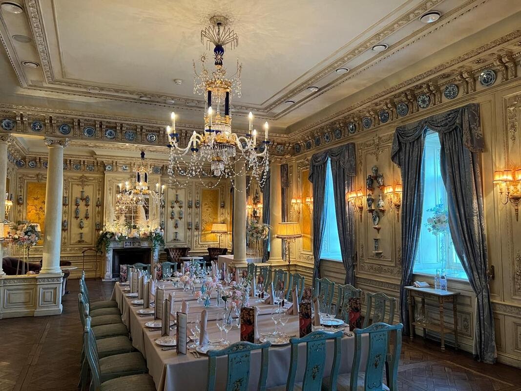 Роскошный, светлый, праздничный Фарфоровый зал выполнен в стиле неоклассики XVIII века. Такое решение продиктовано подлинными колоннами, сохранёнными в интерьере зала. Уютный треск поленьев в каминах наполнит атмосферу праздника теплом и уютом.