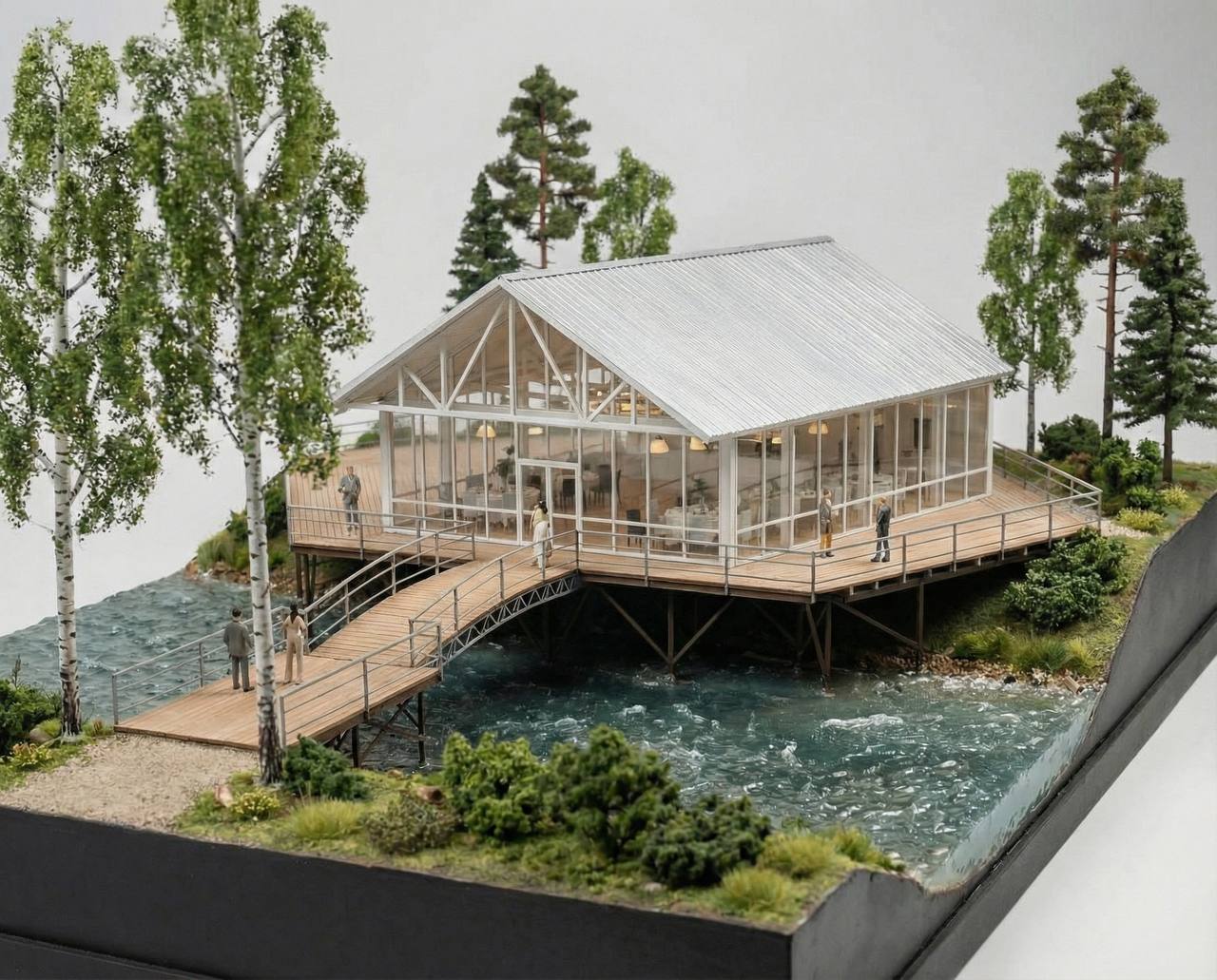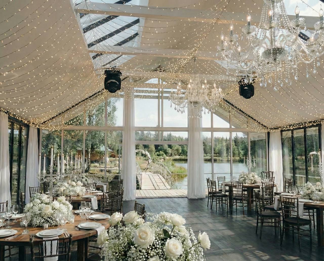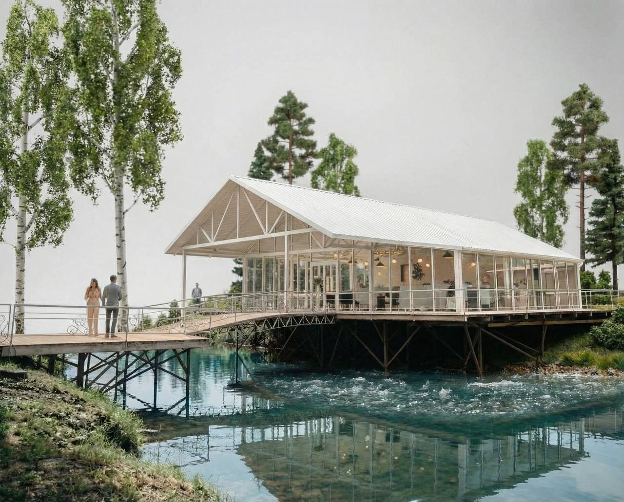 Загородный комплекс на берегу реки, созданный для масштабных свадеб. Главный зал выполнен в современном стиле с панорамным остеклением, что обеспечивает обилие естественного света и визуальный простор. Здесь установлены профессиональные звуковые системы, что позволяет проводить выступления кавер-групп и артистов без аренды дополнительного оборудования. Для церемонии предусмотрен живописный пирс у воды, что гарантирует эффектные кадры и полную уединенность.