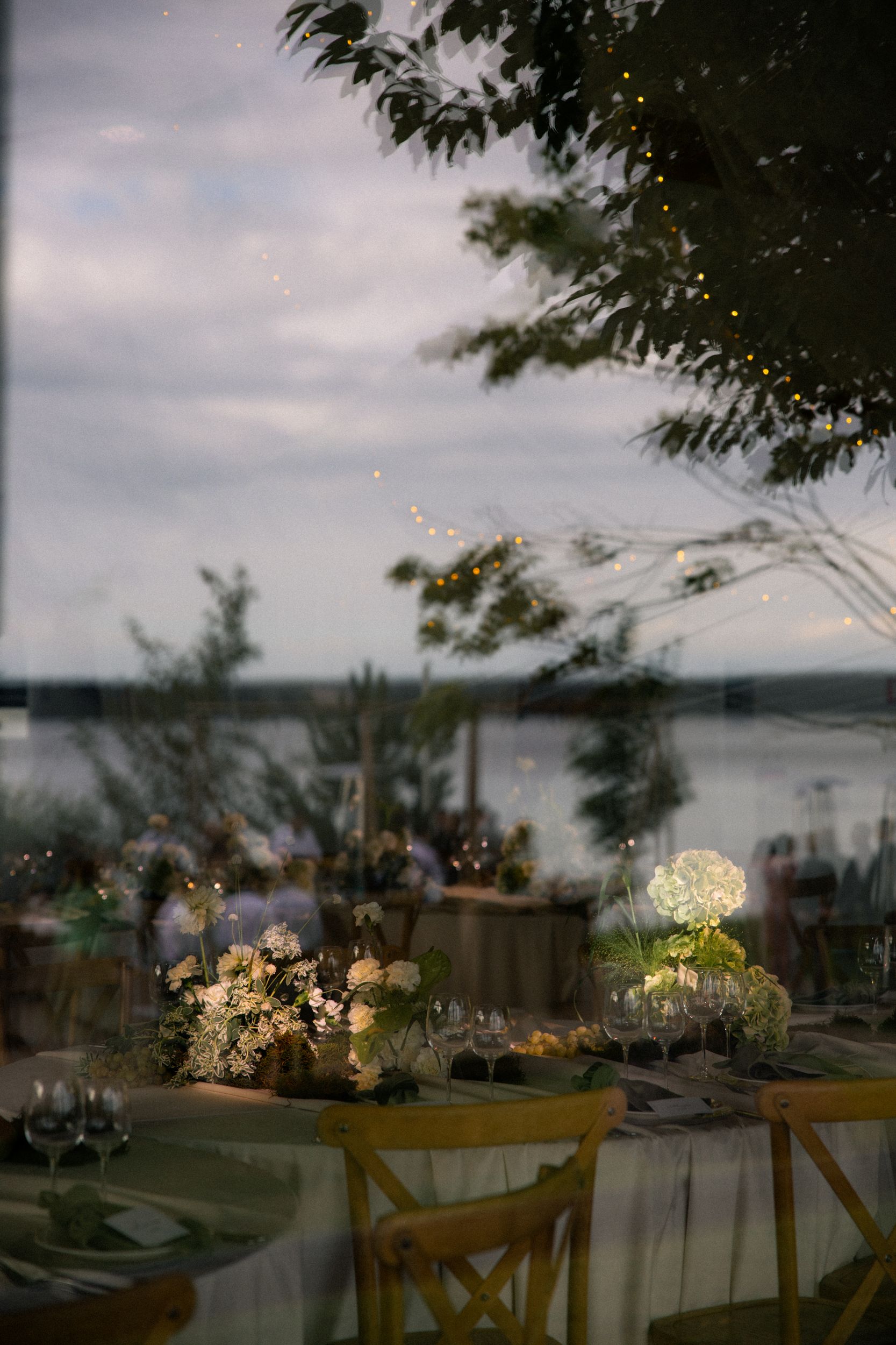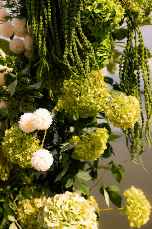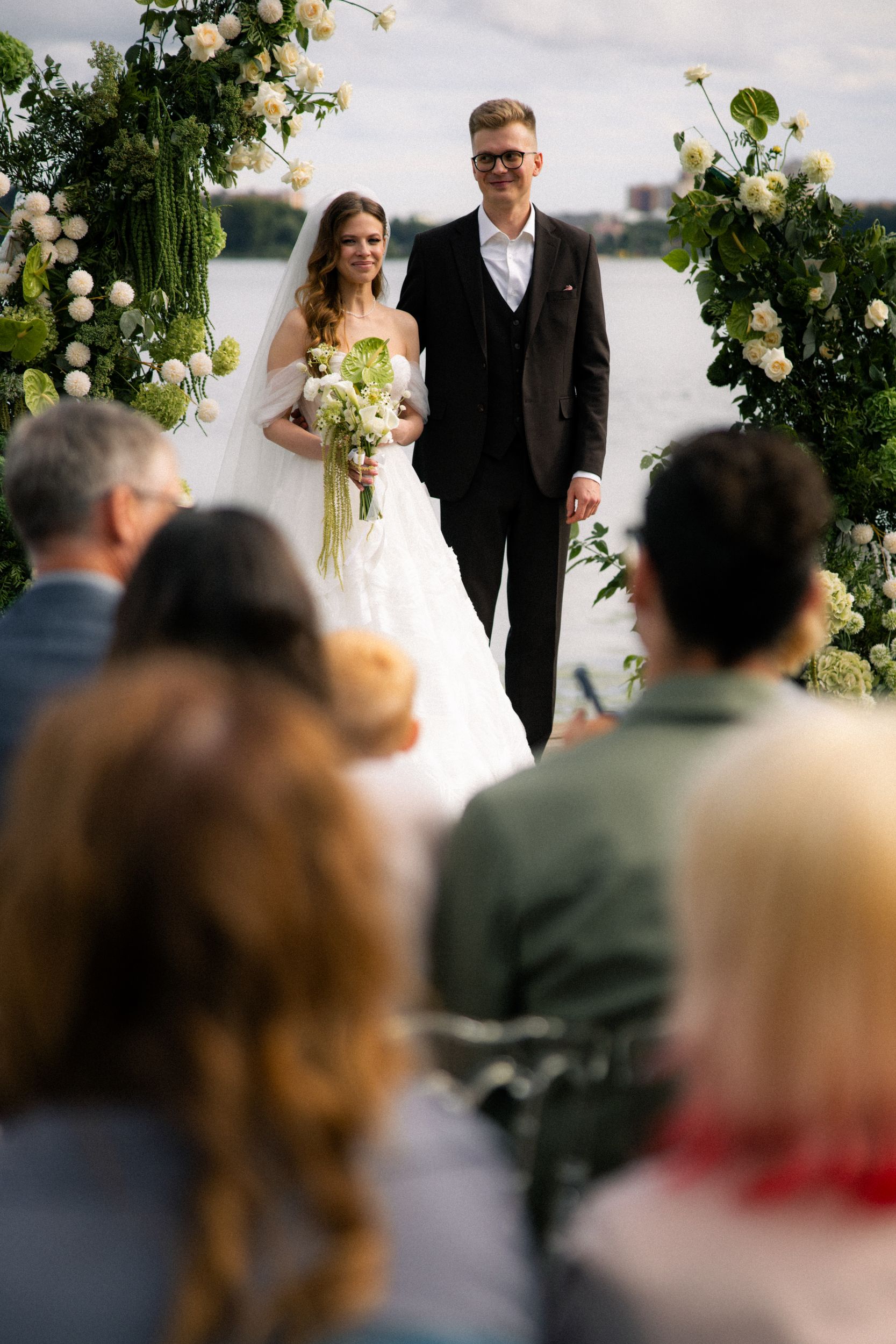 Свадьба Валерии и Максима — пример того, как природная эстетика и современный минимализм могут соединиться в абсолютно гармоничное событие. Церемония прошла на деревянном пирсе у воды: асимметричные зелёные инсталляции с белыми цветами стали естественной рамкой для момента, а спокойная гладь озера создала ощущение камерности и уюта.