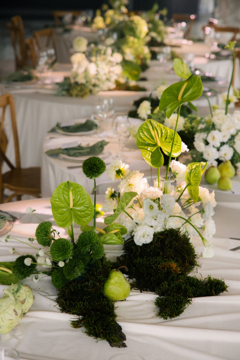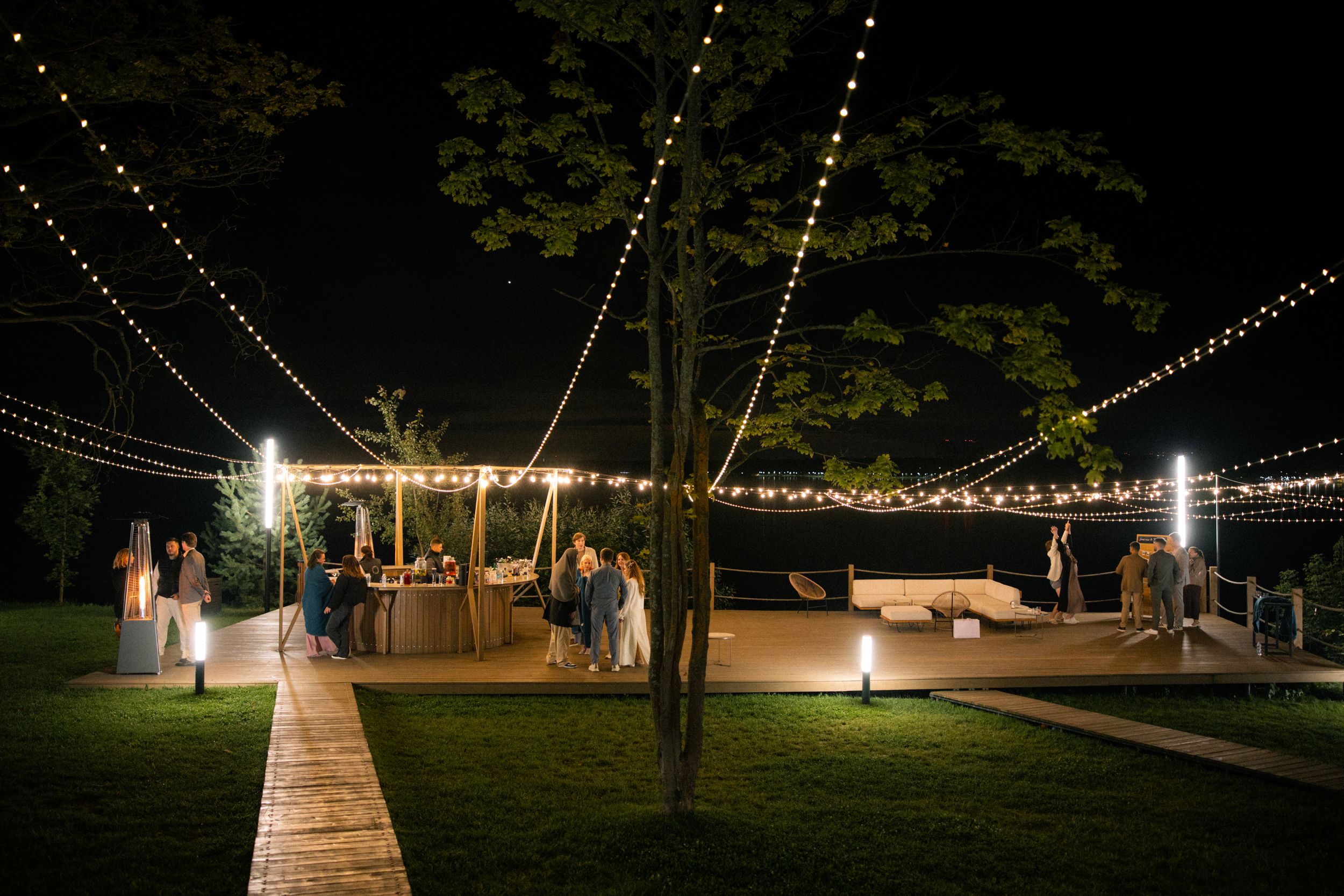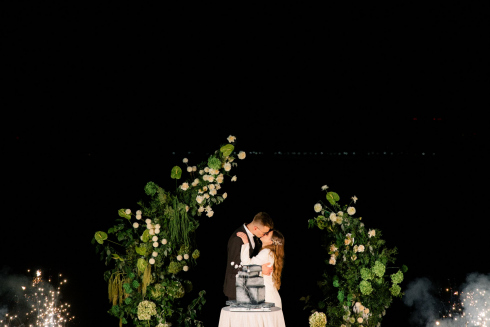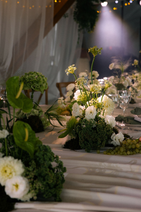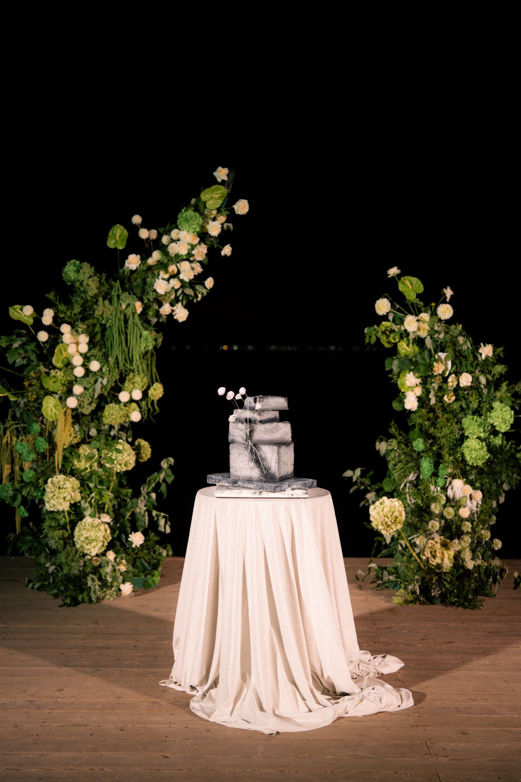 Банкет мы оформили в стиле «натуральной флористики»: композиции из мха, зелени и белых цветов, дополненные фруктами, создавали ощущение живого сада внутри зала. Мягкие драпировки на потолке и тёплая подсветка сформировали очень уютное пространство, в котором гостям было комфортно и приятно проводить время. Вечер получился по-настоящему душевным: тёплая атмосфера, искренние тосты, много живого общения и красивый первый танец пары в клубах лёгкого тумана. Финальным акцентом стал арт-торт — современный, фактурный, выполненный в монохроме, который эффектно смотрелся на фоне ночного неба и нашей зелёной арки.
