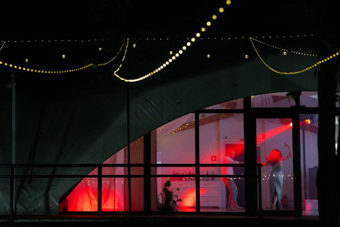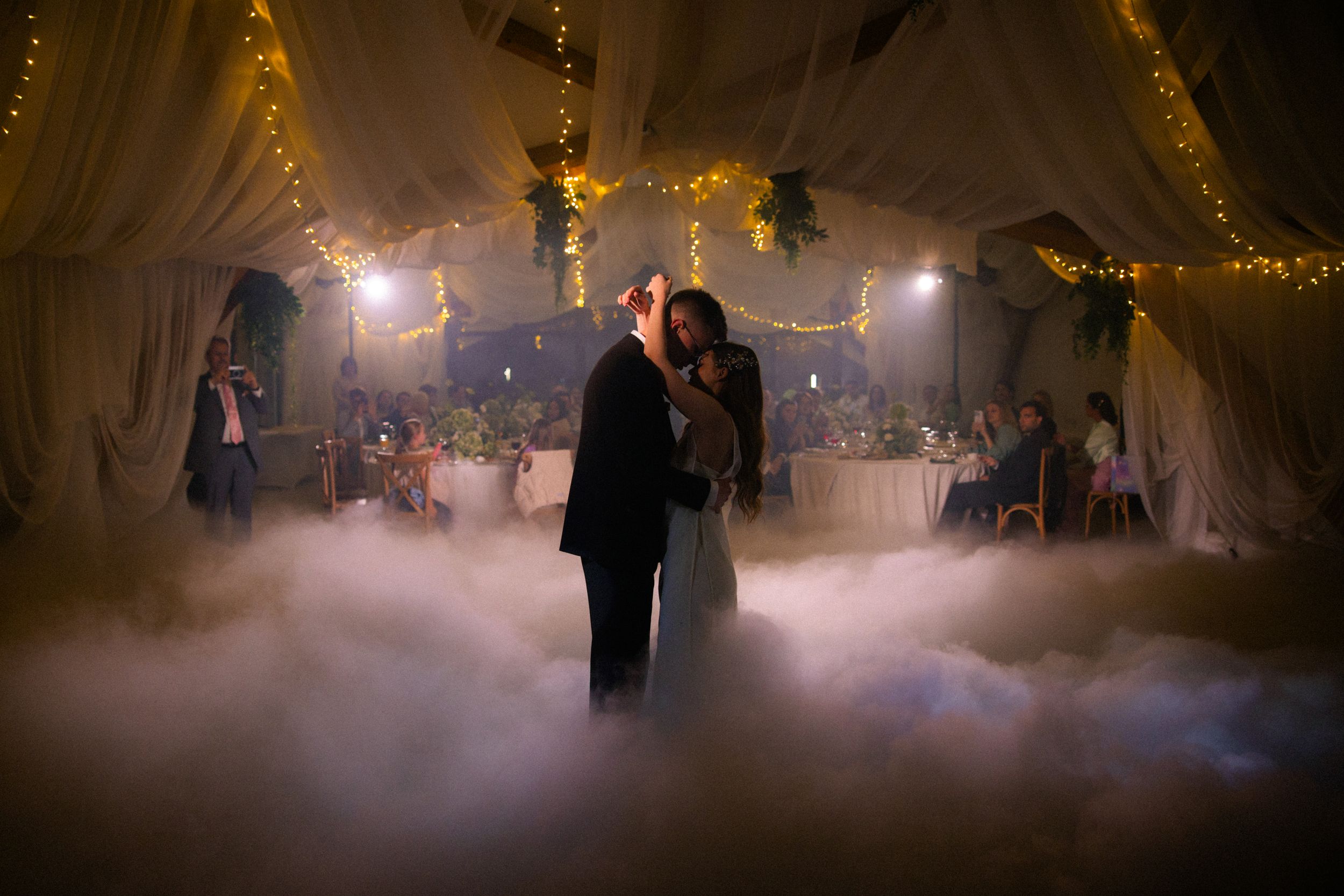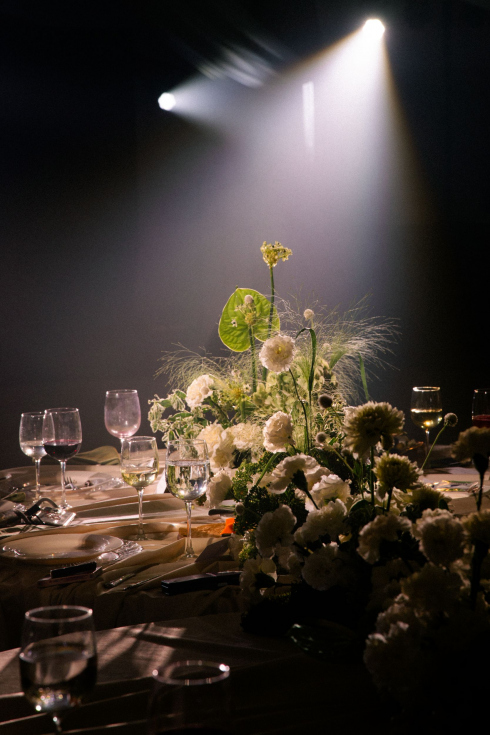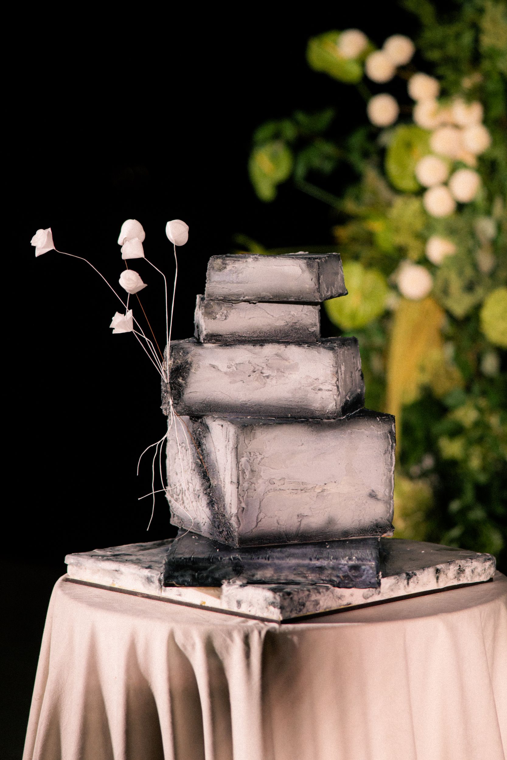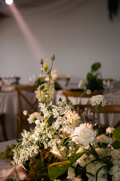 Банкет мы оформили в стиле «натуральной флористики»: композиции из мха, зелени и белых цветов, дополненные фруктами, создавали ощущение живого сада внутри зала. Мягкие драпировки на потолке и тёплая подсветка сформировали очень уютное пространство, в котором гостям было комфортно и приятно проводить время. Вечер получился по-настоящему душевным: тёплая атмосфера, искренние тосты, много живого общения и красивый первый танец пары в клубах лёгкого тумана. Финальным акцентом стал арт-торт — современный, фактурный, выполненный в монохроме, который эффектно смотрелся на фоне ночного неба и нашей зелёной арки.