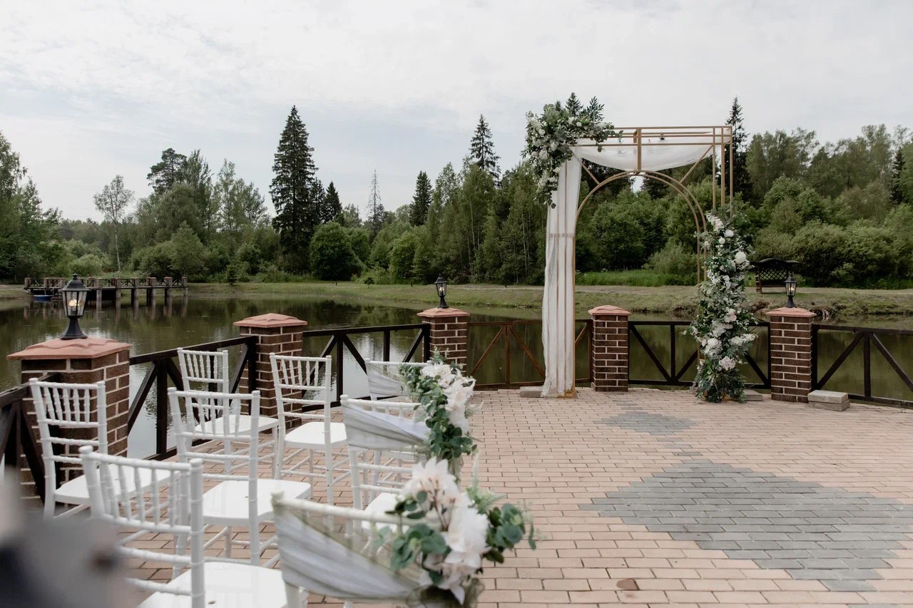 Шатер расположен на одной из набережных парк-отеля. Площадка включает в себя просторную террасу над водой для организации welcome и lounge-зон. Подходит для выездной церемонии и фуршета. Есть размещение гостей.