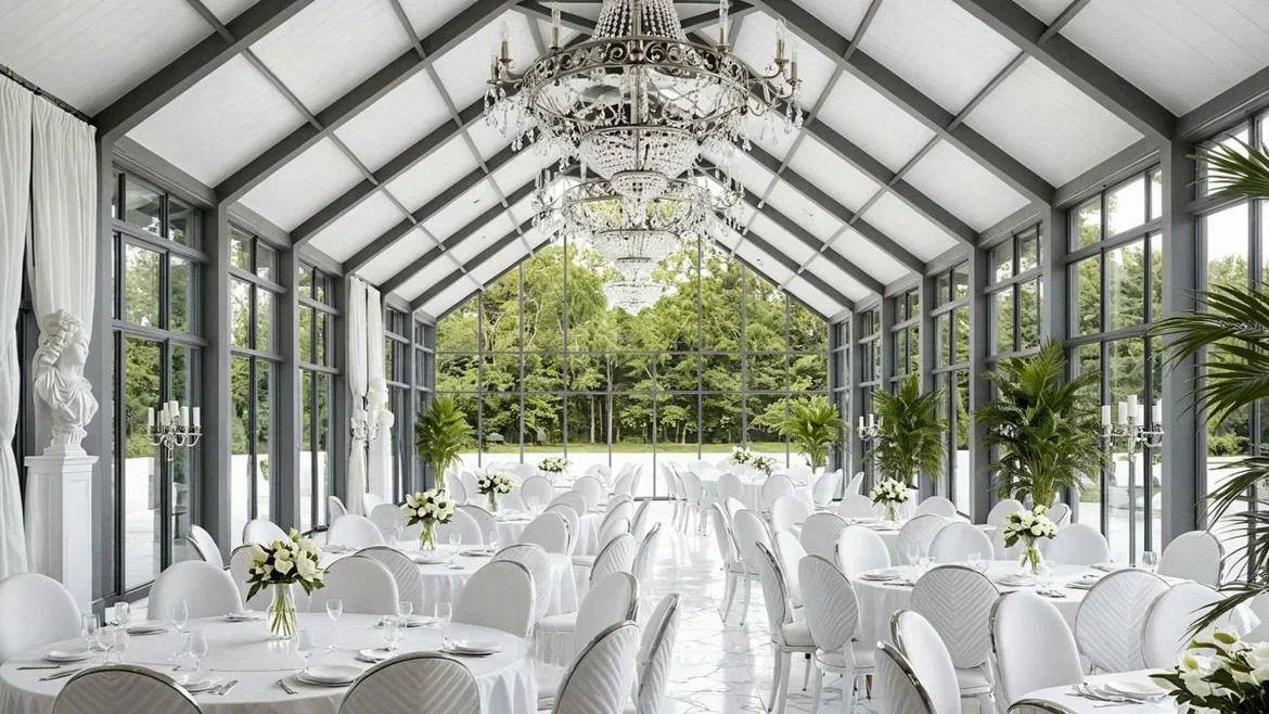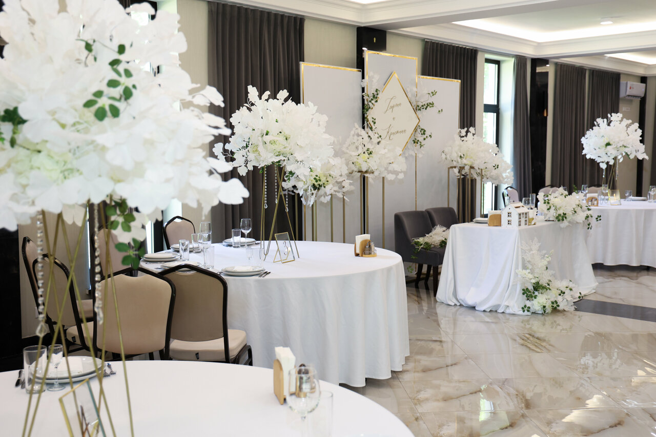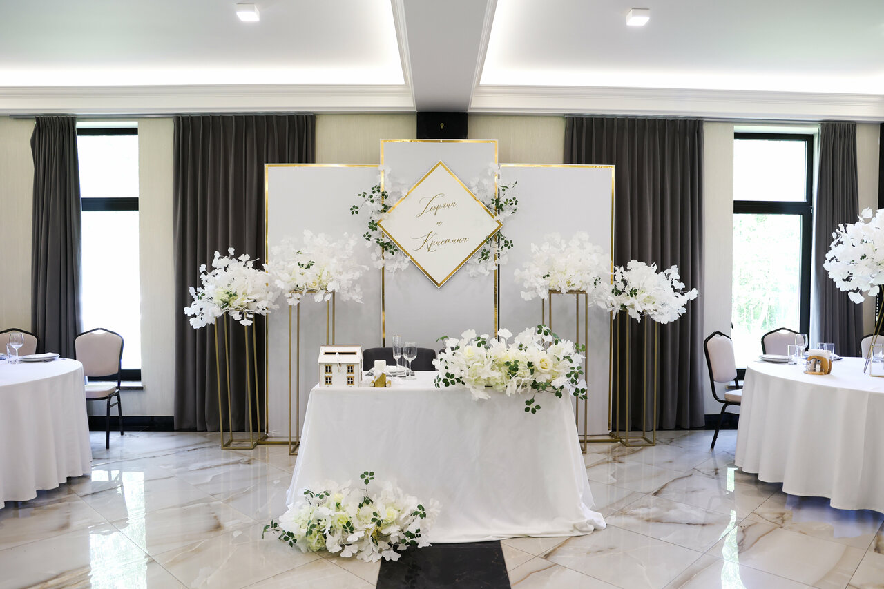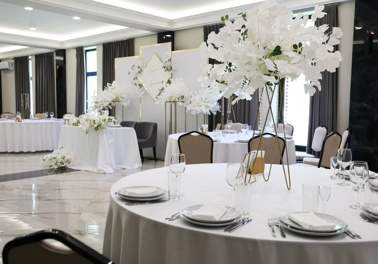 Стильный светлый зал на 150 м² — мечта для тех, кто хочет создать современную, воздушную и элегантную атмосферу. Его нейтральная светлая палитра и панорамные окна, открывающие вид на берёзовую рощу, становятся идеальным чистым фоном для самых смелых декораторских идей. Минималистичный интерьер и масса естественного света позволяют существенно сэкономить на декоре, делая праздник визуально безупречным.