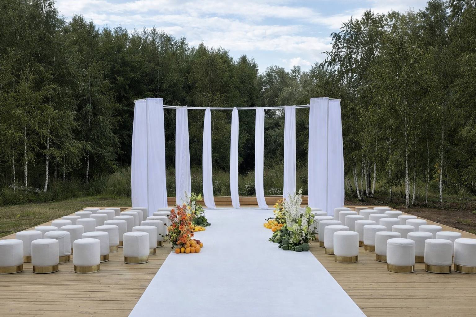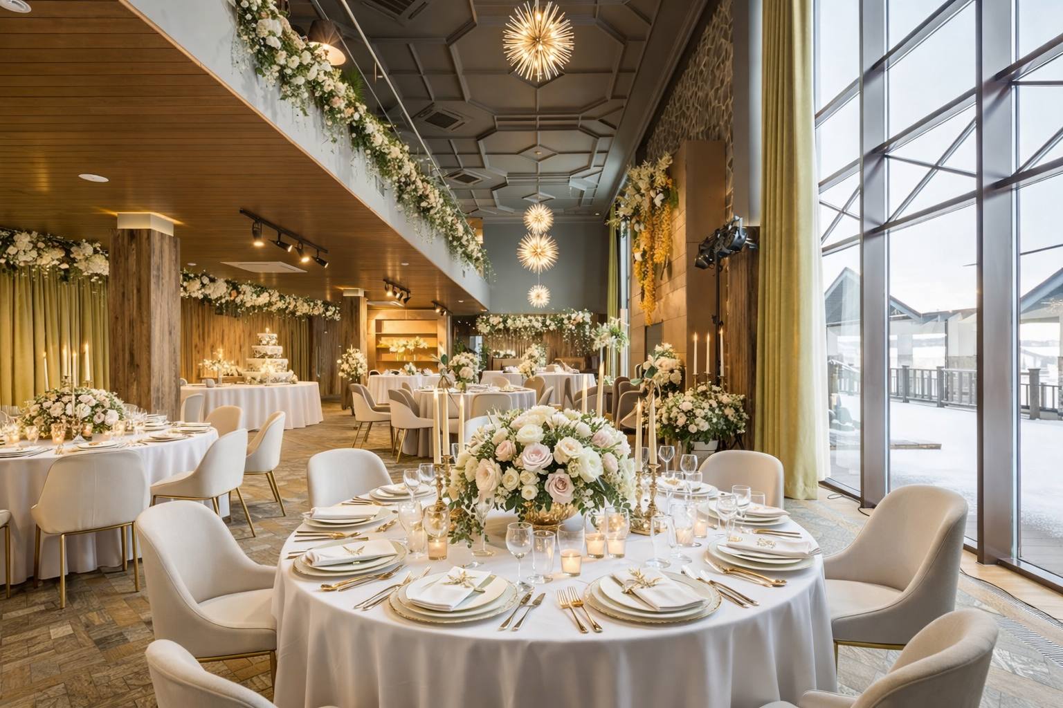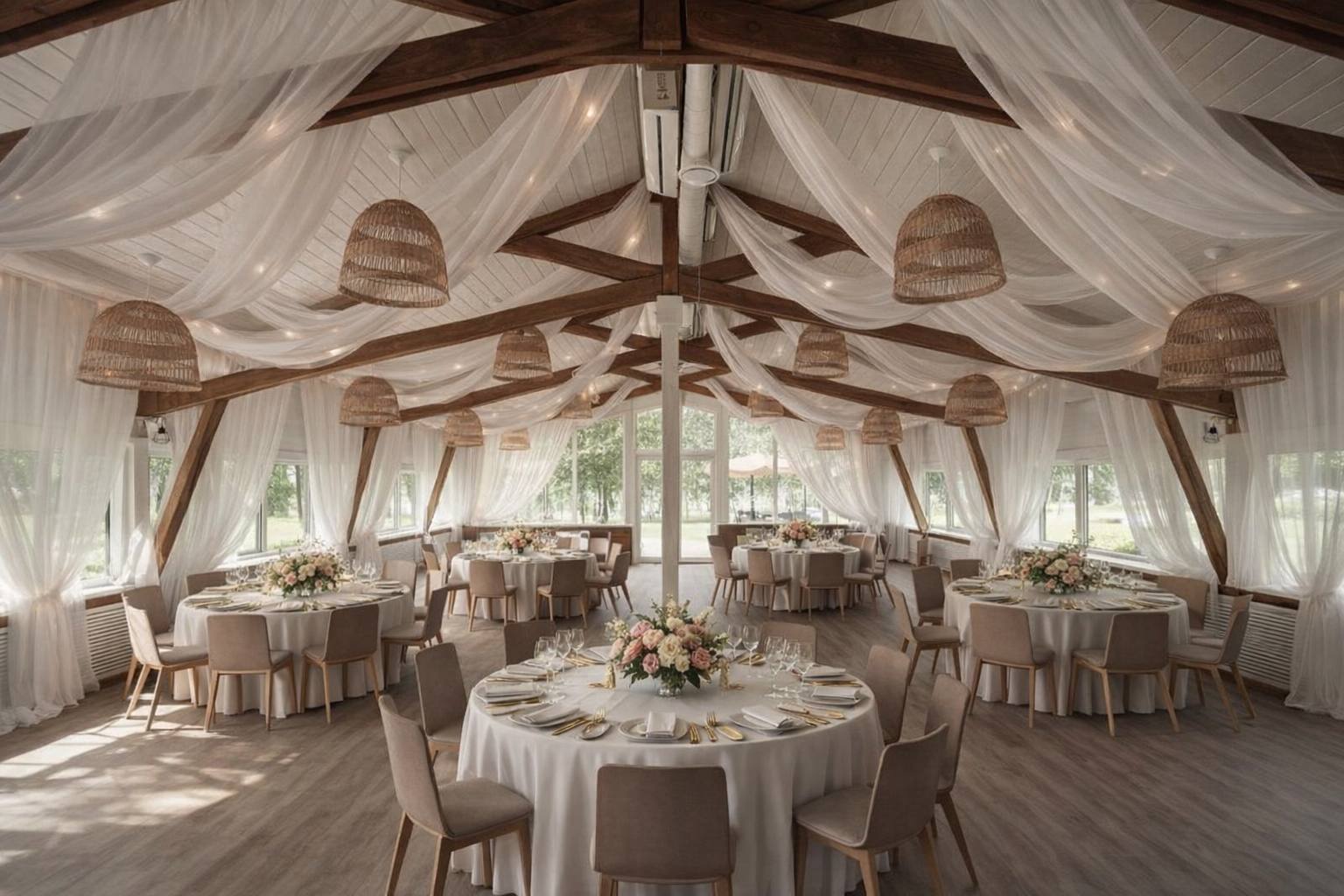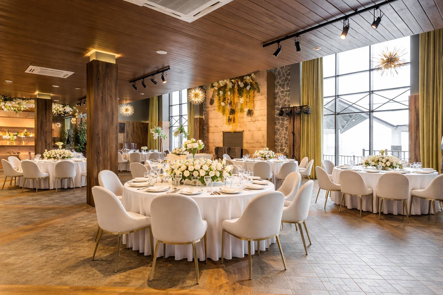 Стильный светлый зал на 150 м² — мечта для тех, кто хочет создать современную, воздушную и элегантную атмосферу. Его нейтральная светлая палитра и панорамные окна, открывающие вид на берёзовую рощу, становятся идеальным чистым фоном для самых смелых декораторских идей. Минималистичный интерьер и масса естественного света позволяют существенно сэкономить на декоре, делая праздник визуально безупречным.