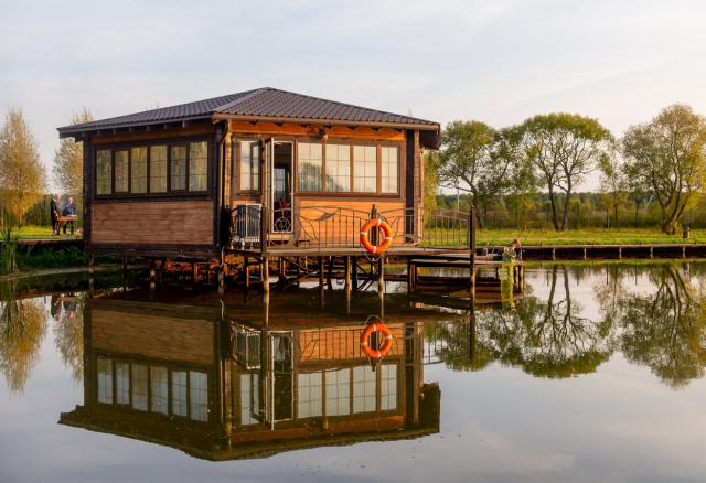 Беседка стоит на сваях и окружена водой. Здесь вы максимально отгорожены от внешнего мира. И ещё вы — полный хозяин пространства: в беседке нет колонн, реализуйте ваши идеи, экспериментируйте. В вашем распоряжении 65 кв. метров и небольшая веранда над водой/