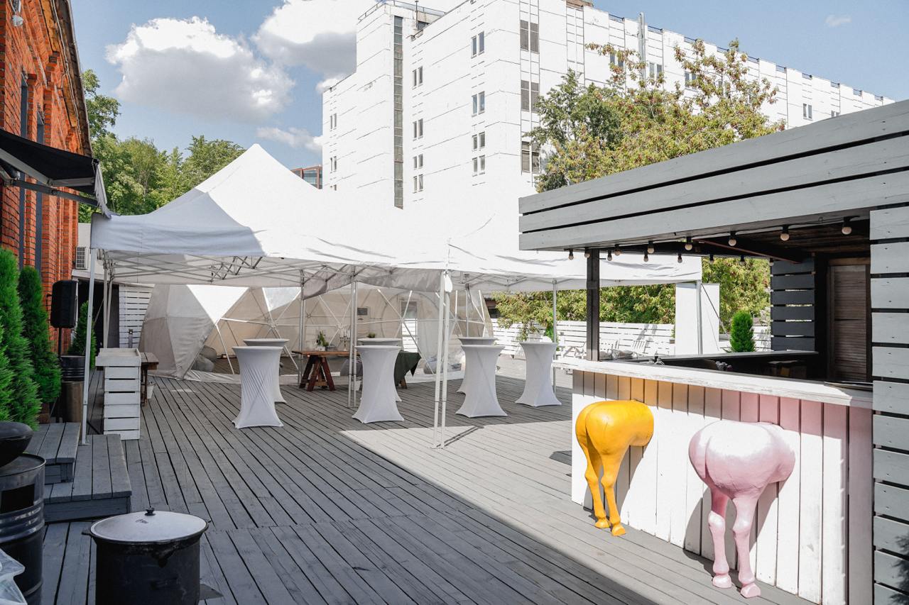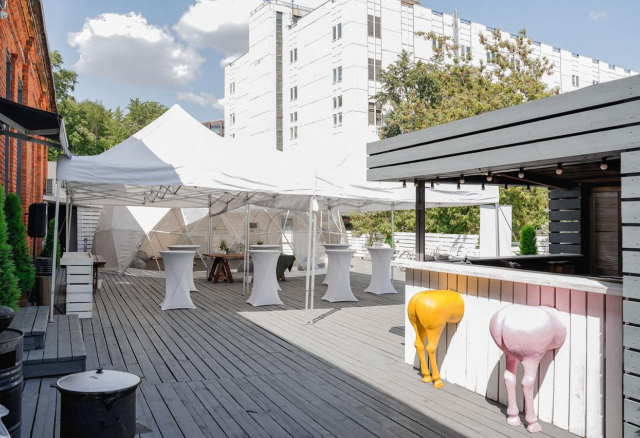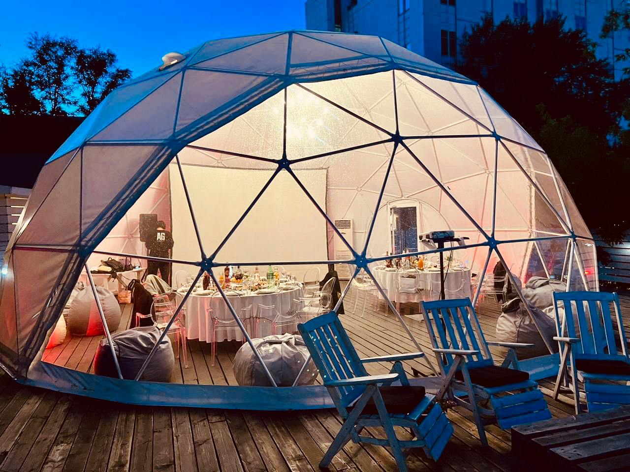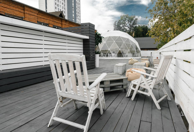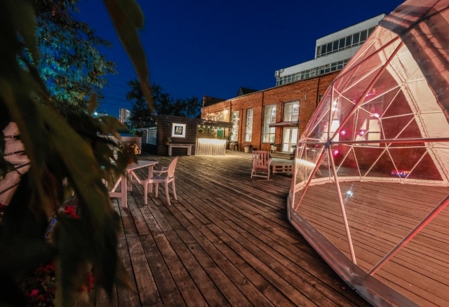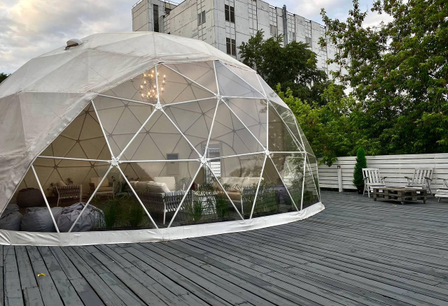 Стильная уютная крыша-веранда со сферическим полупрозрачным шатром с климатической системой. Площадка имеет отдельную входную группу и расположена на первой линии, подниматься всего один этаж. Площадь веранды – 500 м2; площадь шатра – 80 м2.