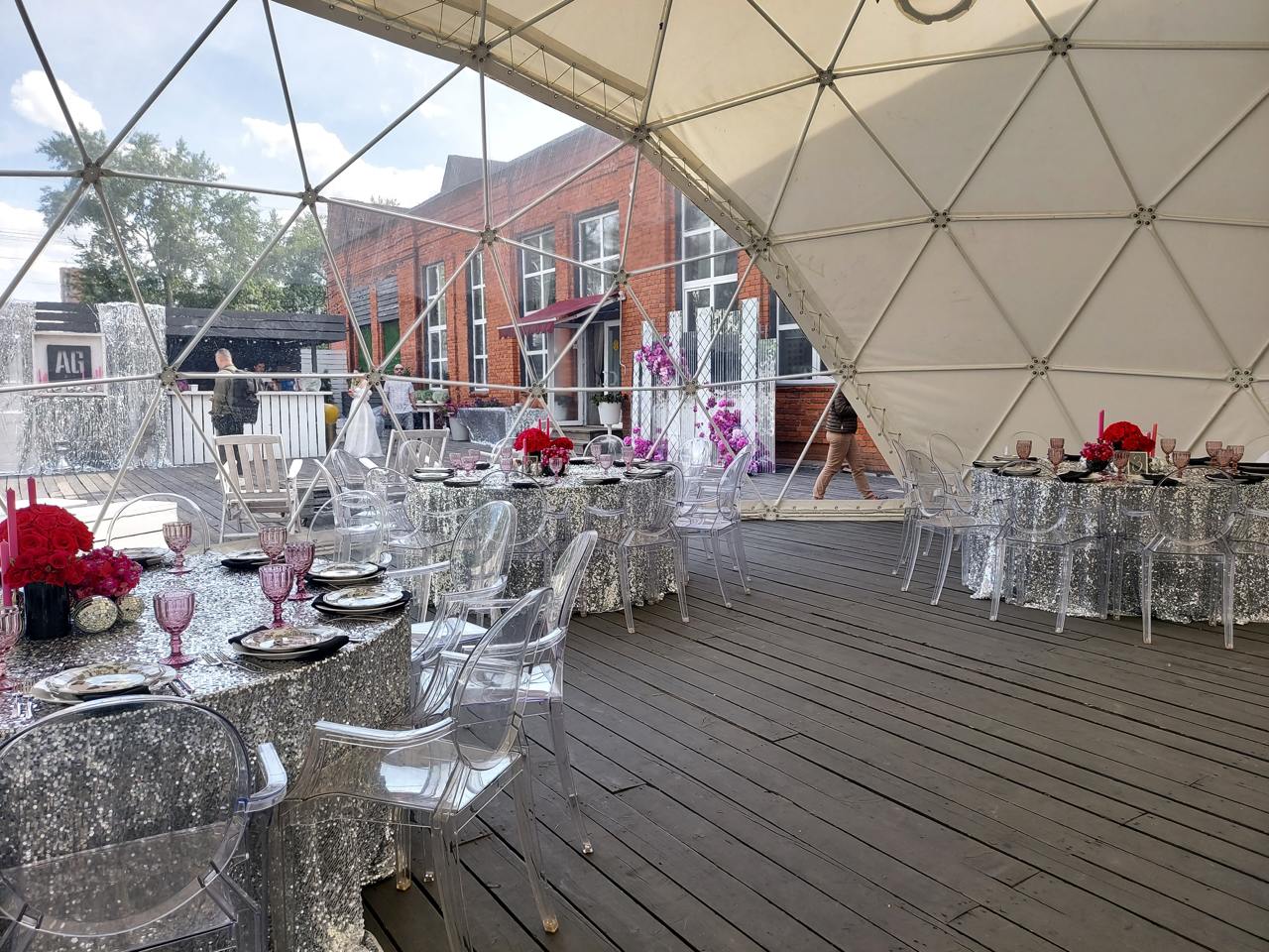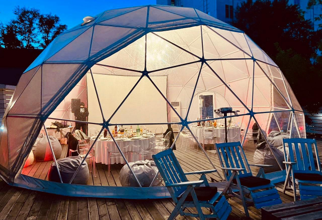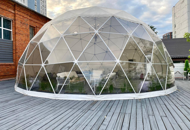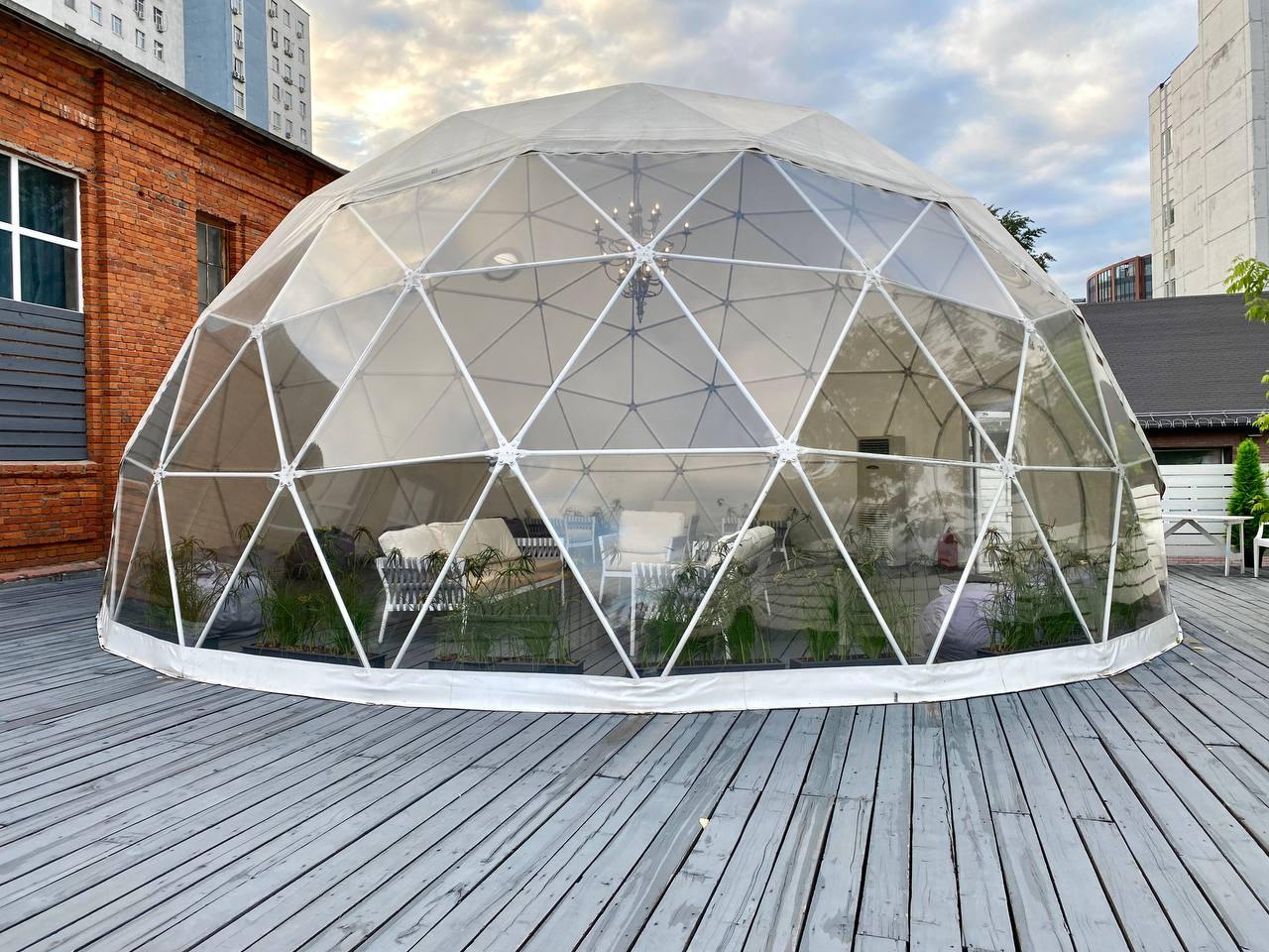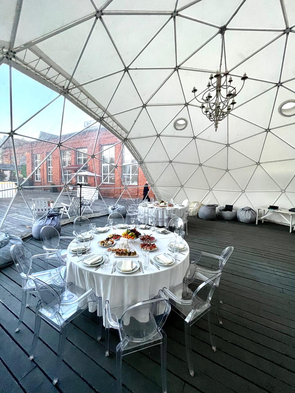 Стильная уютная крыша-веранда со сферическим полупрозрачным шатром с климатической системой. Площадка имеет отдельную входную группу и расположена на первой линии, подниматься всего один этаж. Площадь веранды – 500 м2; площадь шатра – 80 м2.