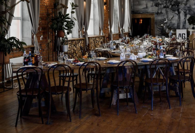 Невероятно теплое, светлое, воздушное пространство. С большим вкусом здесь обыгрывается стилистика сельского дома в Альпах с его типичными элементами: полом и потолочными балками из старинной доски, собранным вручную камином, шторами с подхватами, пейзажной росписью стен, антикварной мебелью, высокими потолками, панорамными окнами. Площадь зала – 235 м2.