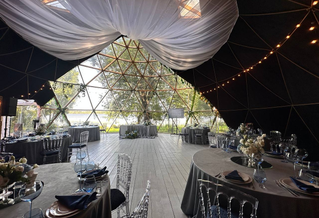 На территории комплекса имеется живописный сад, где возможно организовать выездную церемонию и фотосессию. В большом доме на берегу озера жених и невеста смогут провести утренние сборы, а также комфортно разместиться гости. Для проведения мероприятий имеется большой банкетный зал. Интерьер выполнен в светлых тонах, что позволяет использовать любое стилистическое оформление. В теплое время года торжественный банкет возможно организовать в просторном купольном шатре с панорамным остеклением. Также на территории комплекса есть SPA-зона с бассейном и собственный пирс.