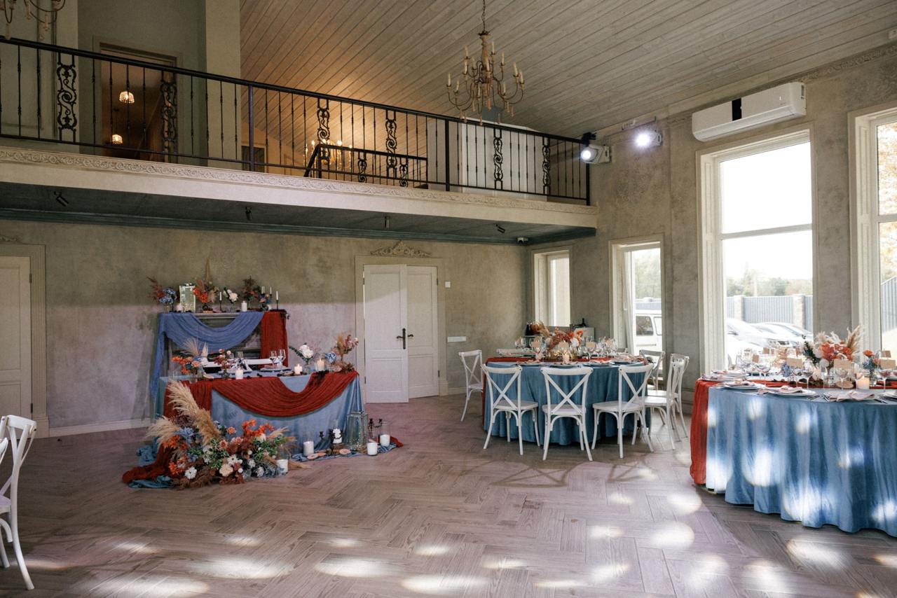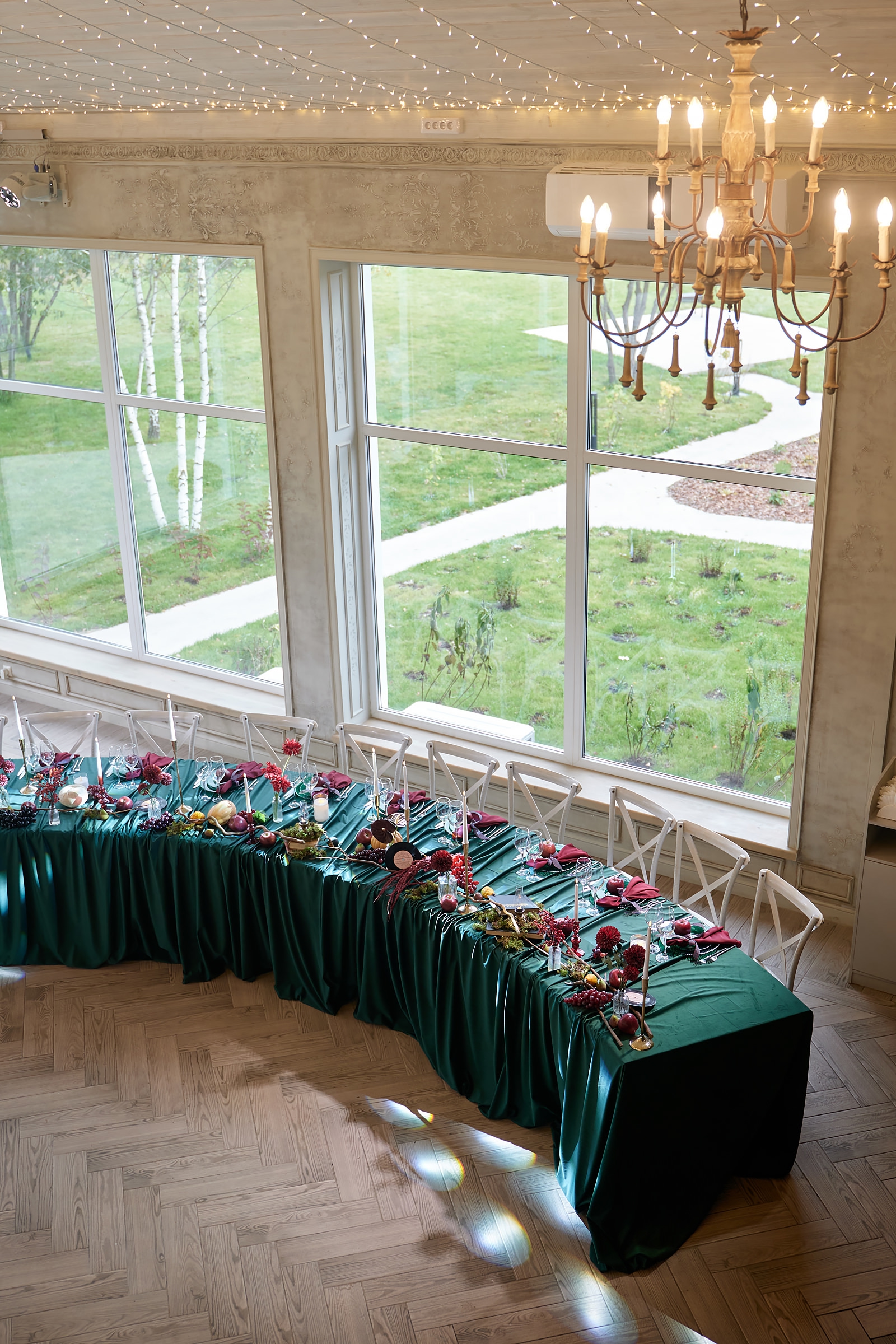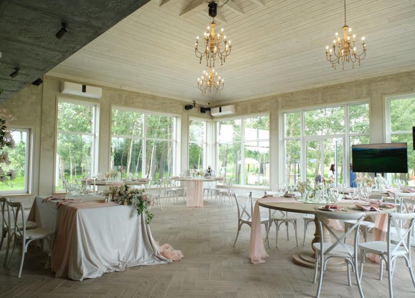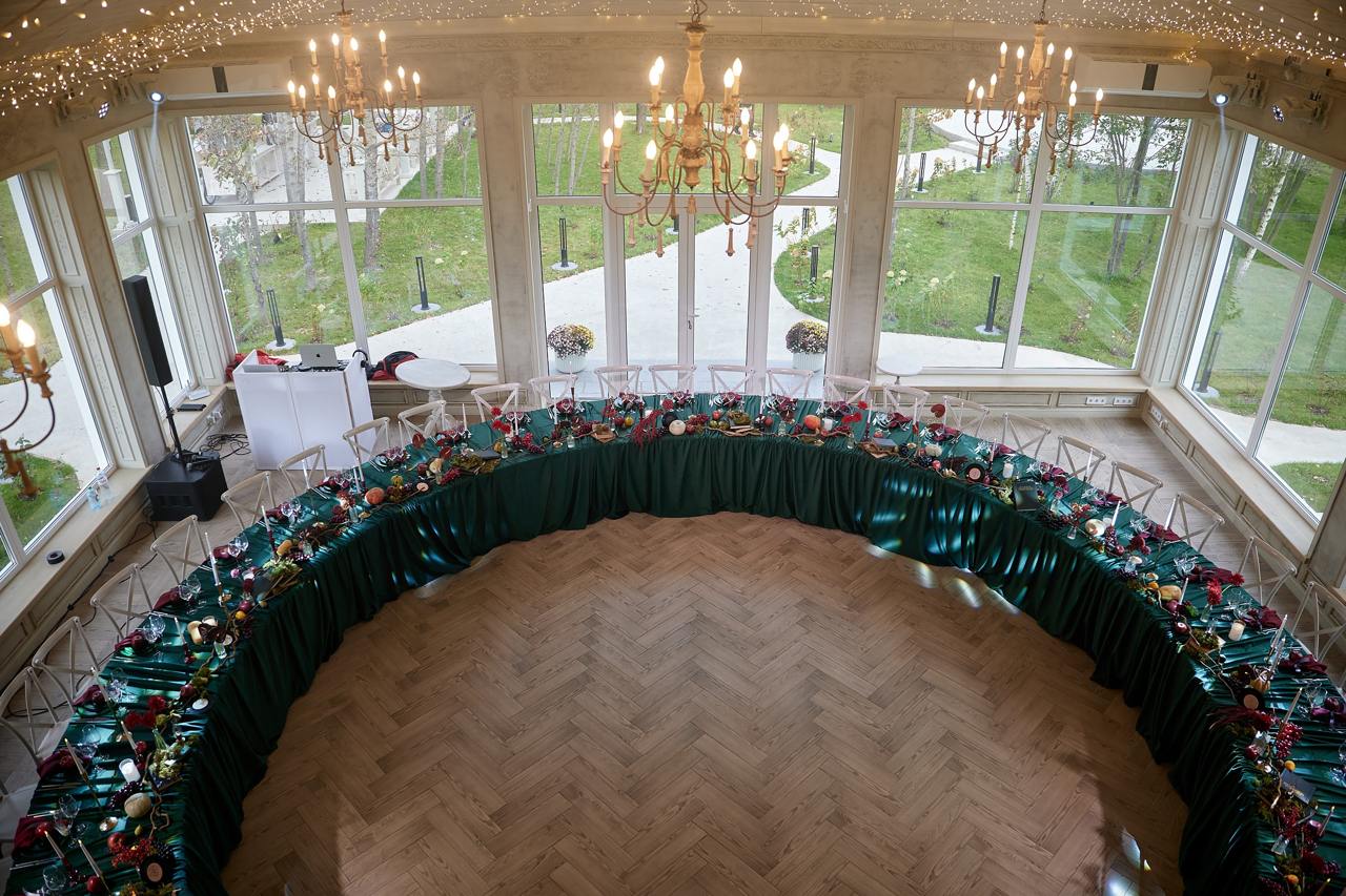 Панорамные окна дают много ественного света для красивых фото, а высокие потолки ещё больше придают залу воздушности.