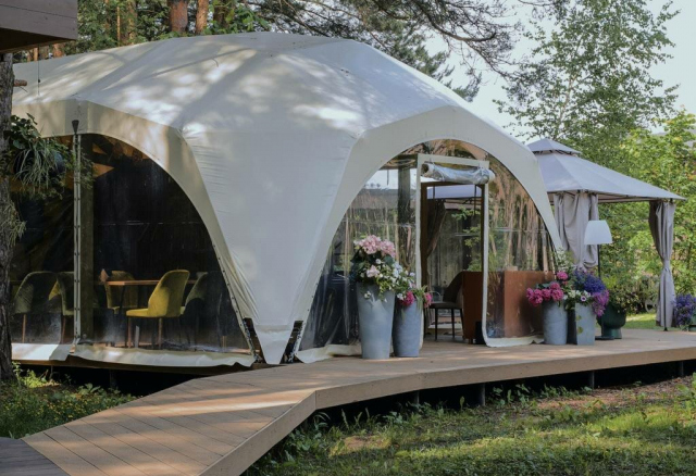 Территория ресторана и гостиницы на лесной опушке с верандой.