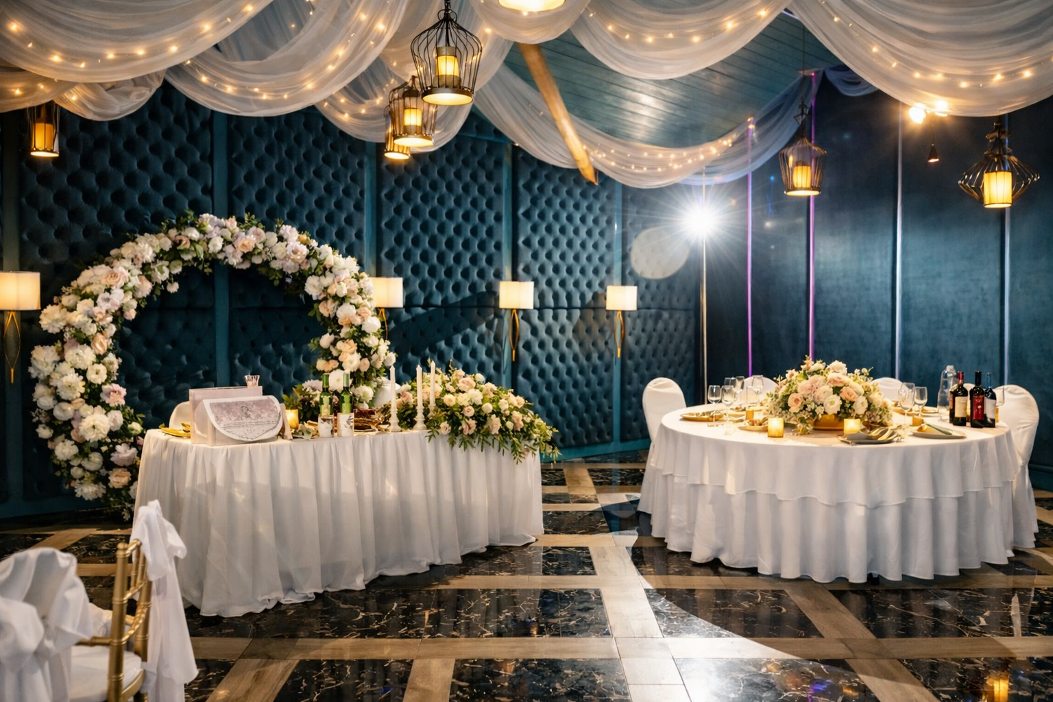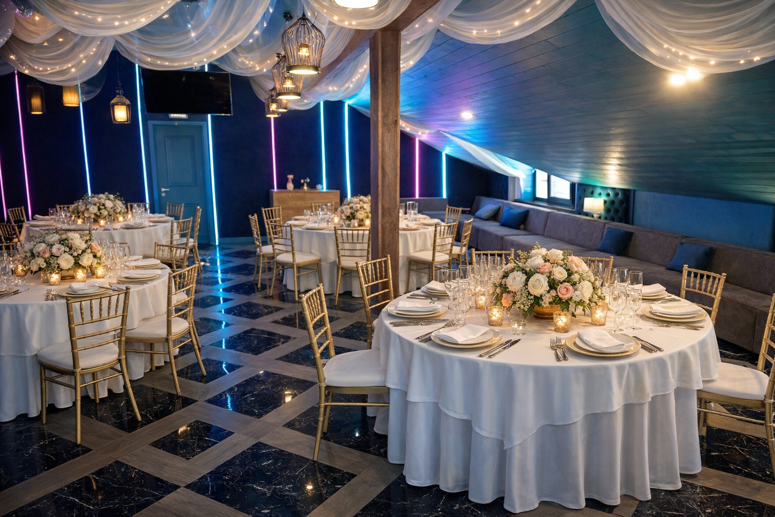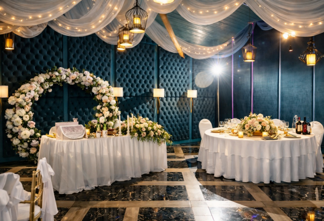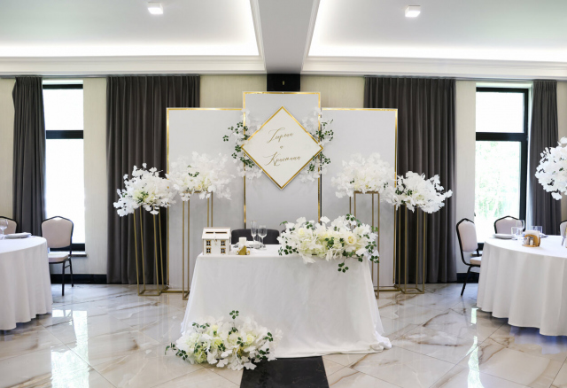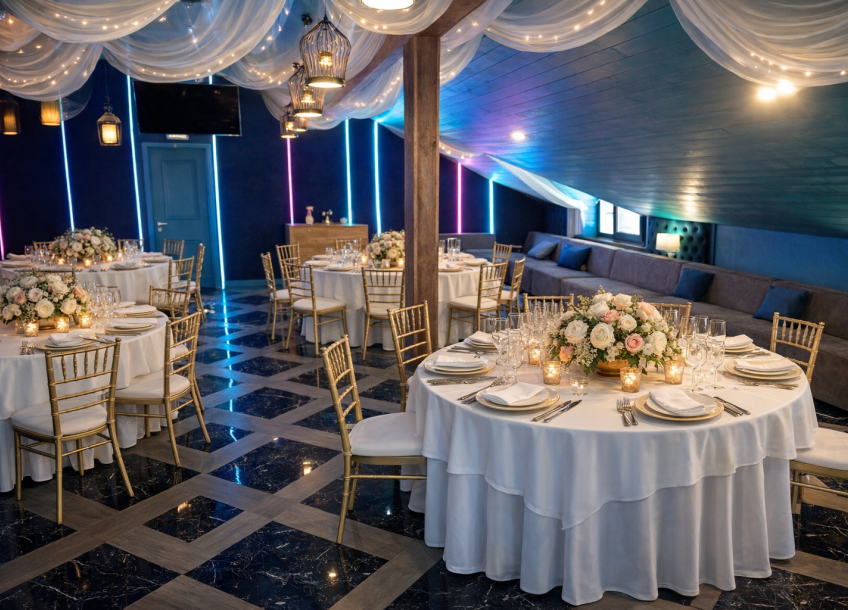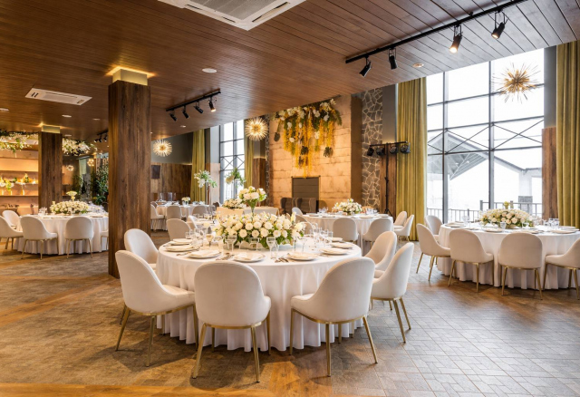Это самый большой зал комплекса площадью 270 м² — идеальная площадка для свадебного банкета или крупного корпоратива. Элегантный дизайн в тёплых тонах, панорамные окна и естественный свет создают по-настоящему праздничную атмосферу. Пространство легко адаптируется благодаря трём VIP-зонам и профессиональному оборудованию, позволяя провести как классический банкет, так и грандиозный приём.