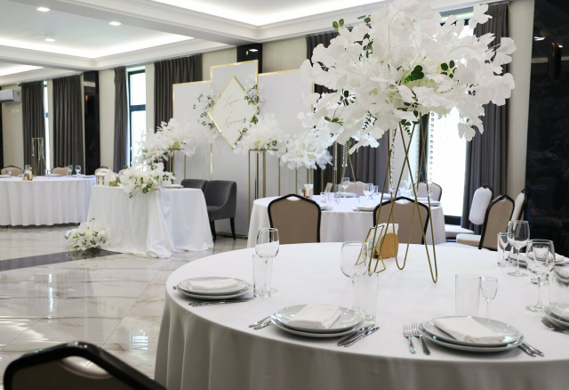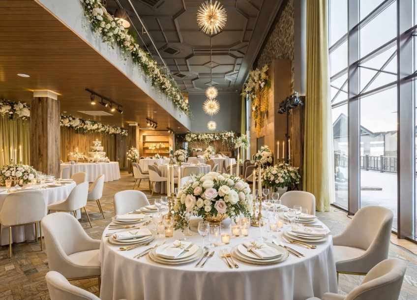 Стильный светлый зал на 150 м² — мечта для тех, кто хочет создать современную, воздушную и элегантную атмосферу. Его нейтральная светлая палитра и панорамные окна, открывающие вид на берёзовую рощу, становятся идеальным чистым фоном для самых смелых декораторских идей. Минималистичный интерьер и масса естественного света позволяют существенно сэкономить на декоре, делая праздник визуально безупречным.