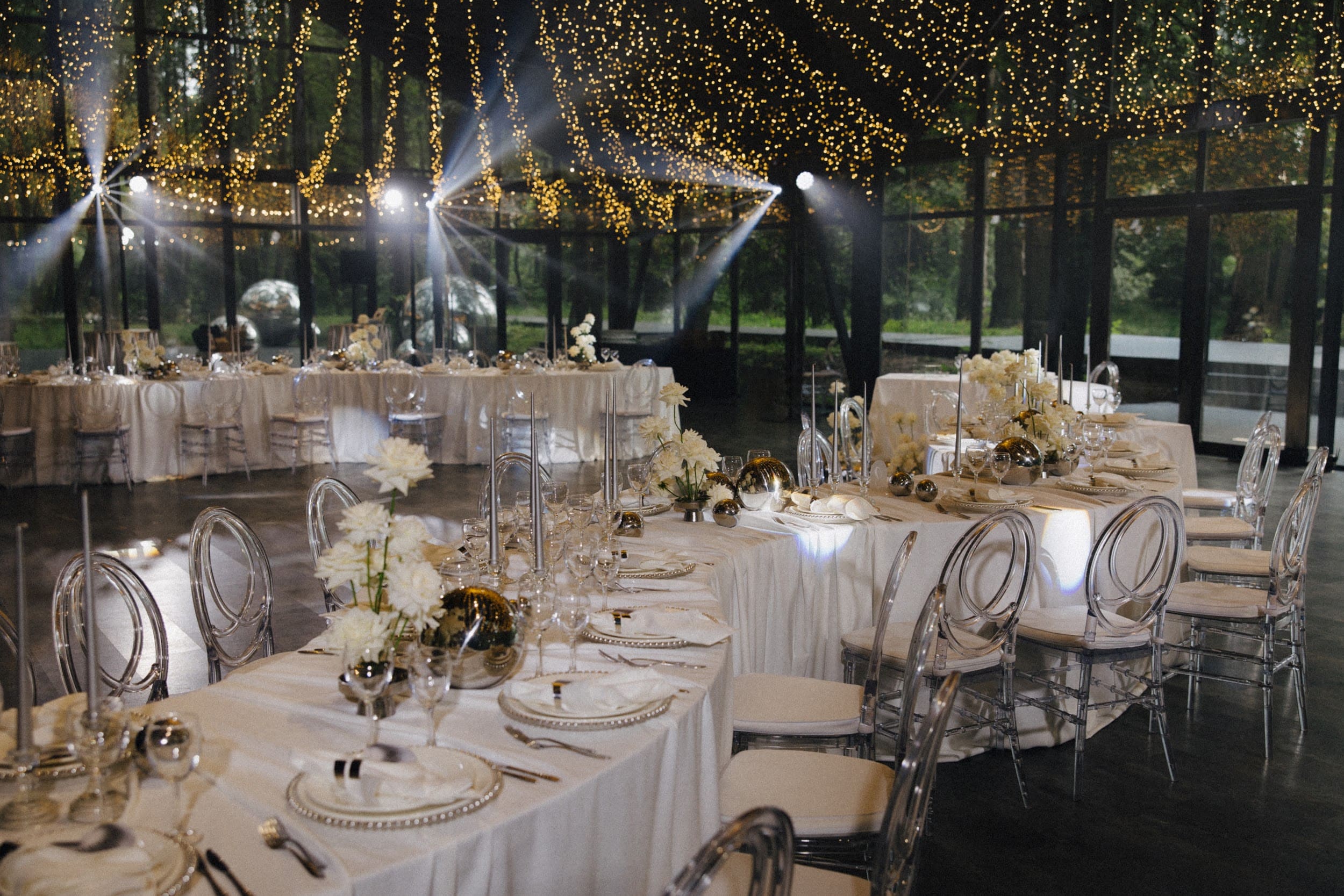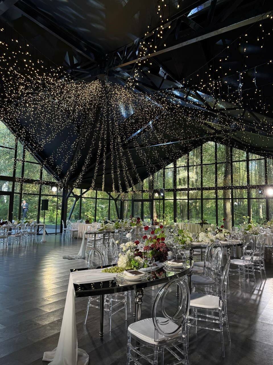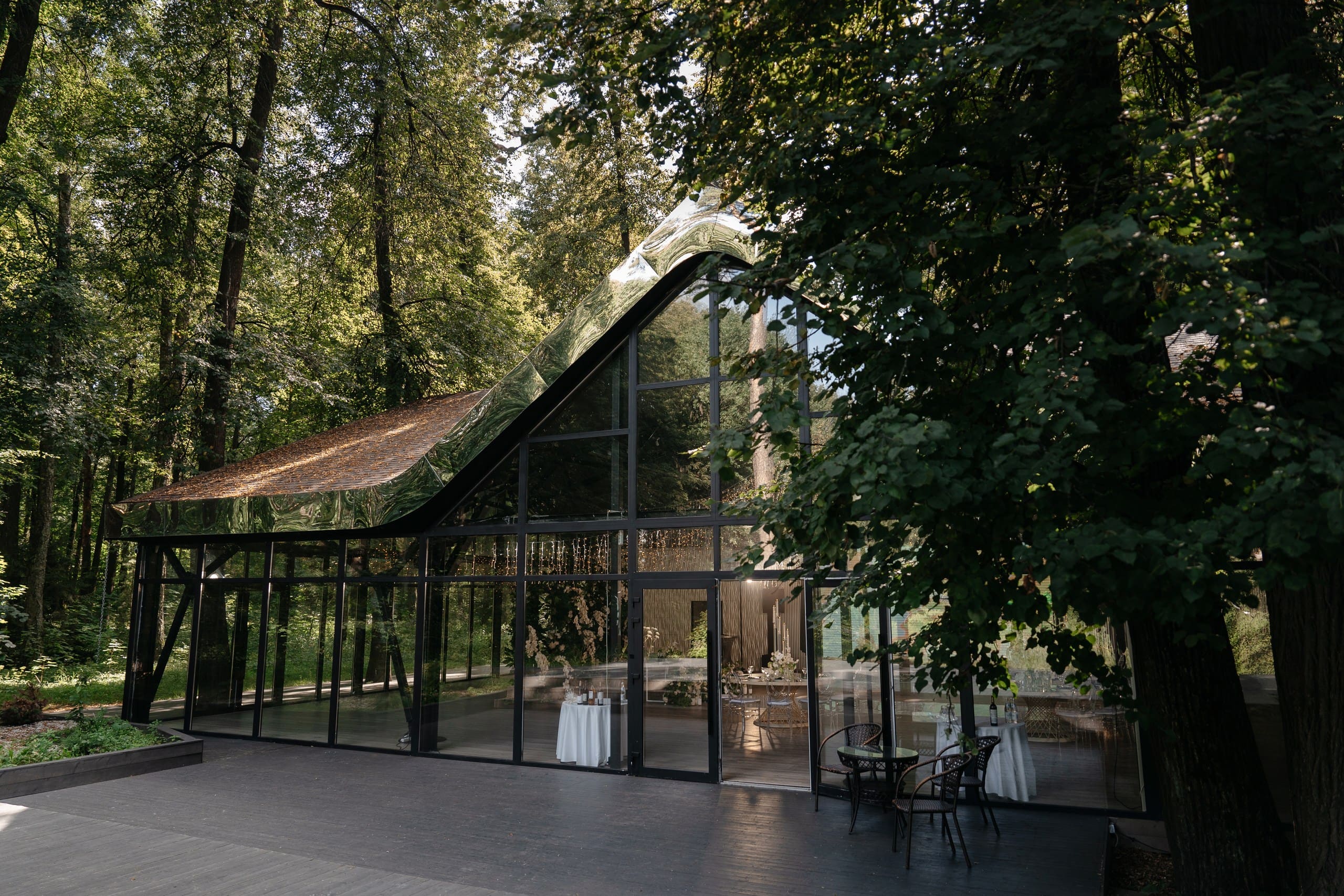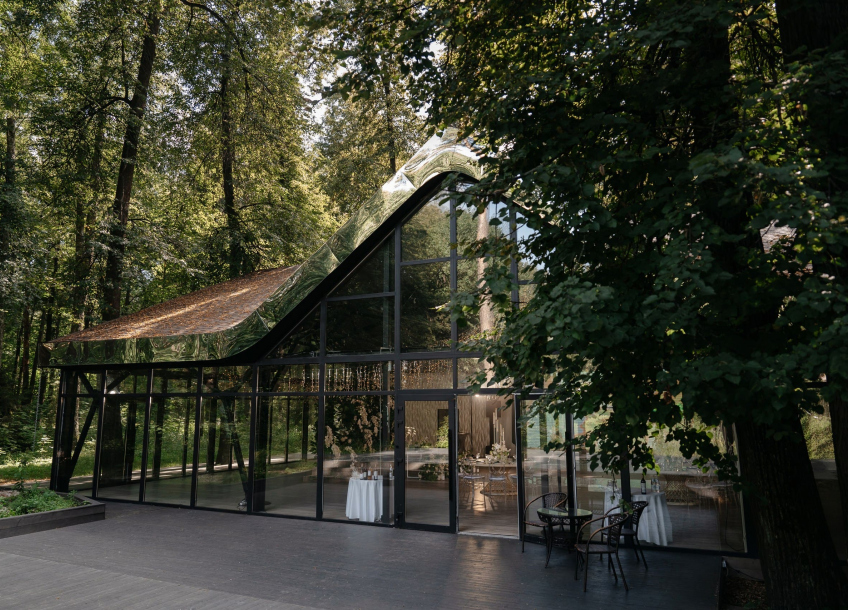 Обновленный LES Event House удивит вас блеском хрустальных люстр и роскошной лесной верандой с панорамным остеклением. Три локации для церемонии - две на фоне пруда под сенью деревьев и одна в лесном массиве.