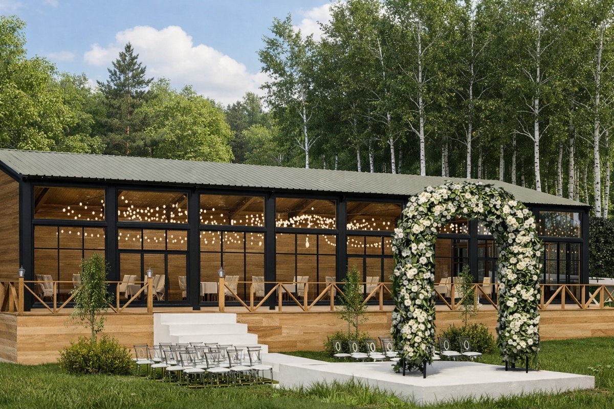 Комплекс расположен в лесу на берегу Клязьминского водохранилища, 8 км. от МКАД по Дмитровскому шоссе. Волшебное место для проведения свадебного торжества. Живописная природа березового леса создает романтичную, сказочную атмосферу, а впечатляющий вид на Клязьминское водохранилище чарует и завораживает своей красотой. На территории располагаются белоснежные арочные шатры. Просторная территория позволят провести выездную церемонию, масштабную вечеринку на свежем воздухе и запустить незабываемый свадебный салют.