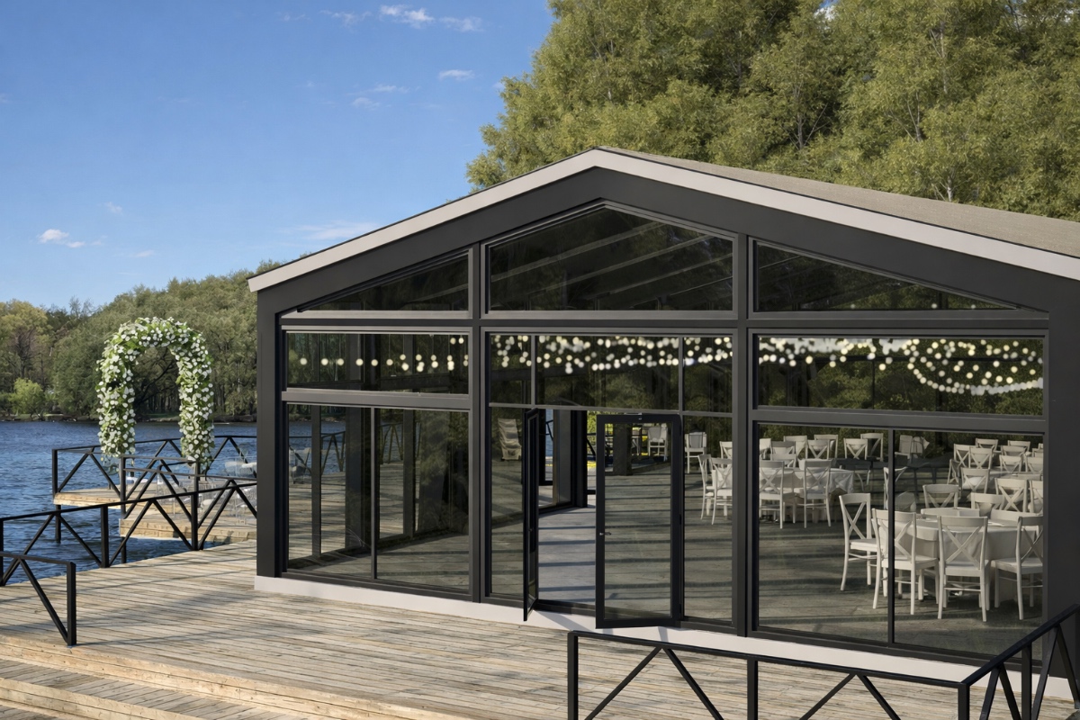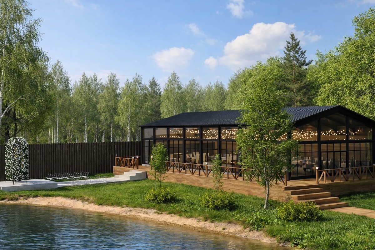 шатёр 200 м2 расположен прямо у воды на лесной территории 600 м2. К шатру относится небольшой причал, который можно использовать для выездной регистрации брака.