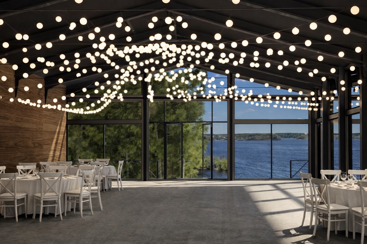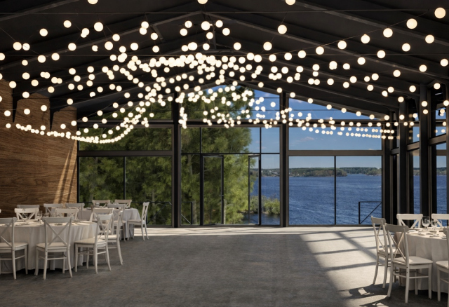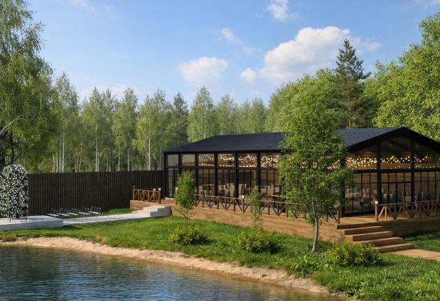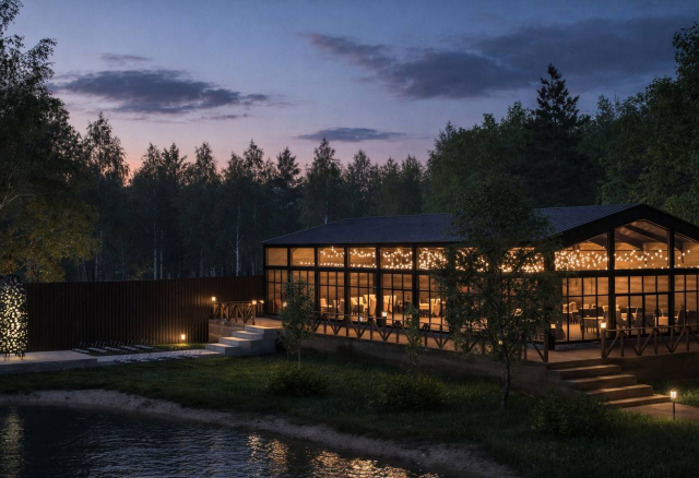 Стеклянная веранда 260 м2 расположена на деревянном помосте над самой водой. Впечатляющие видовые характеристики на простирающуюся водную гладь и лес. К вкранде может подлетать вертолёт и причаливать яхта. Великолепная идея для выездной регистрации брака.