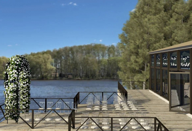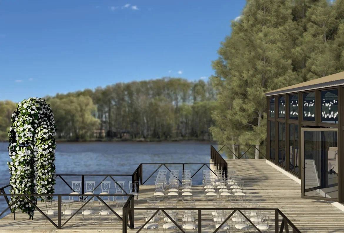 шатёр 200 м2 расположен прямо у воды на лесной территории 600 м2. К шатру относится небольшой причал, который можно использовать для выездной регистрации брака.
