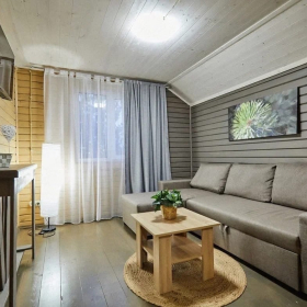 В доме есть две стильные комнаты и просторная гостиная, где вы сможете получить удовольствие от общения с друзьями и близкими. Наслаждайтесь атмосферой уюта и тепла.
