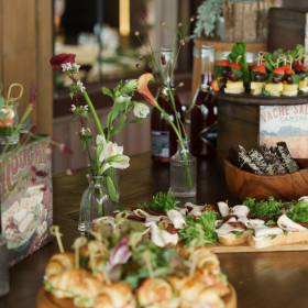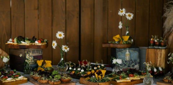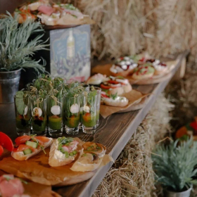 Фуршет можно организовать на бочках или на сене, предложив гостям разные варианты закусок и напитков. Можно оформить все под анимационные станции. В качестве меню мы можем предложить компактные и удобные порции, как говорят ‘на один укус’. Маленькие канапе, тарталетки с разными начинками, сырная и мясная нарезка, всевозможные виды мяса и морепродуктов на шпажках и на кростини.