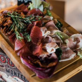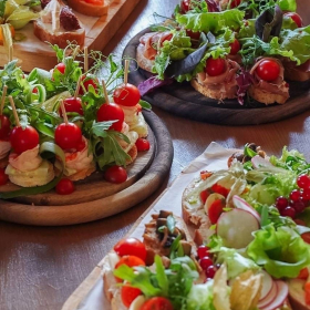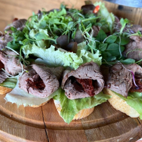 - Холодные закуски. Состоят из 8-10 видов различных нарезок из мяса, рыбы, овощей, канапе, брускетт и паштетов. Каждому гостю достанется 400 гр. закусок.