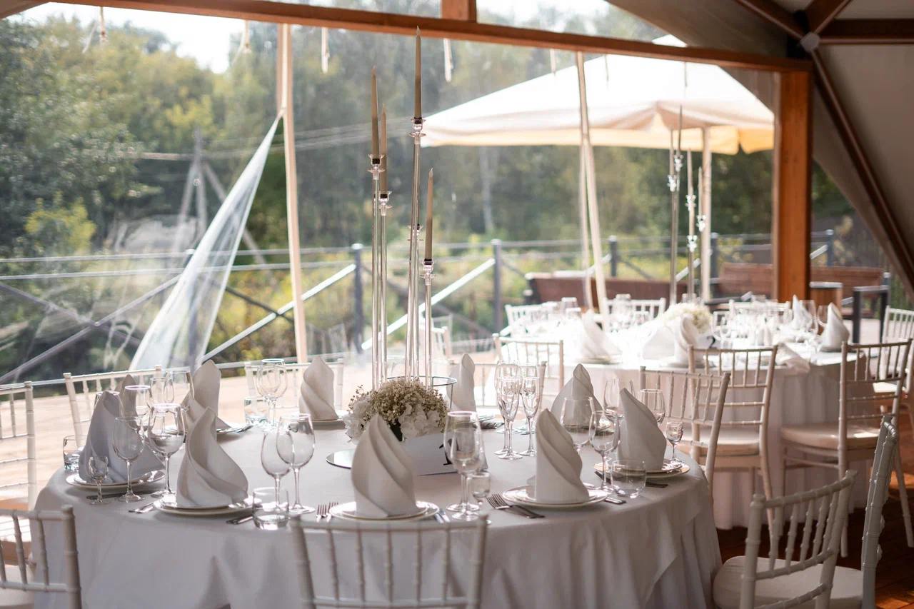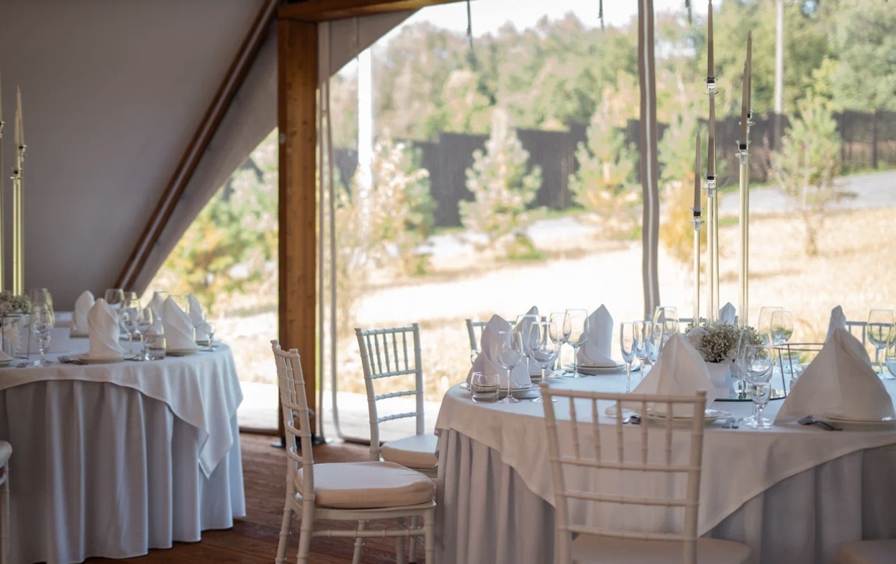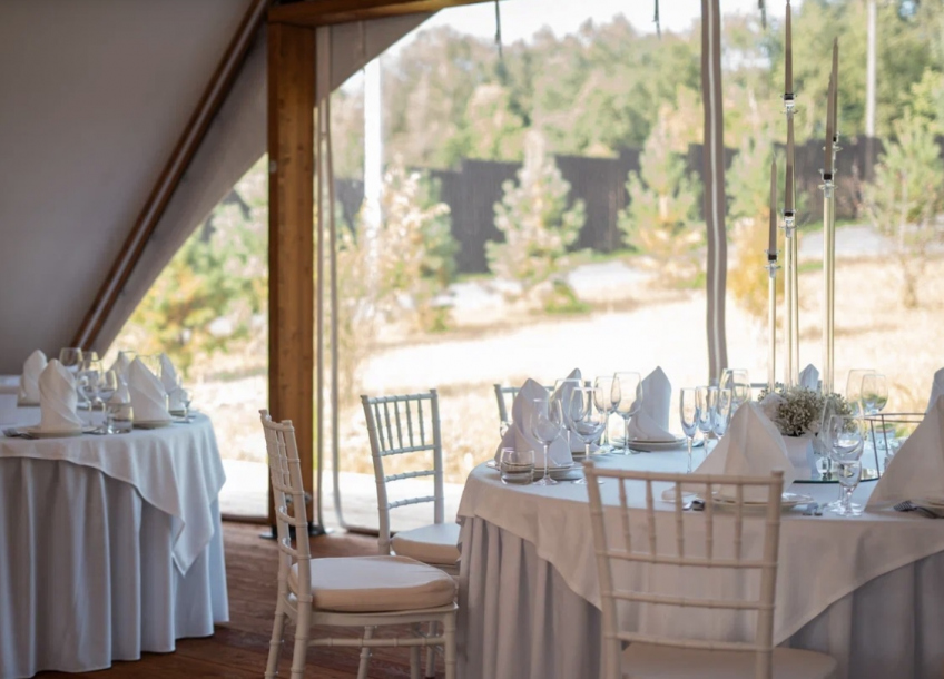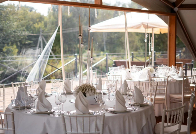 В стоимость аренды входит: стулья банкетные, круглые банкетные столы.