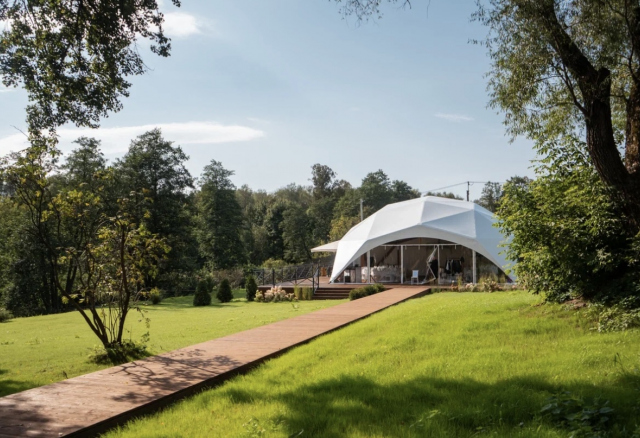 Располагается в уединенной зоне отеля, в окружении лесного массива и большого пространства вокруг с естественным газоном. Рядом с шатром установлена костровая площадка, которую можно арендовать дополнительно.