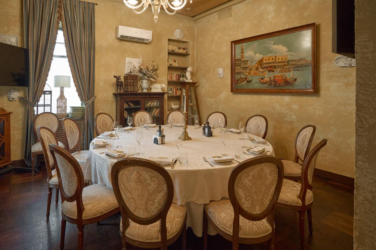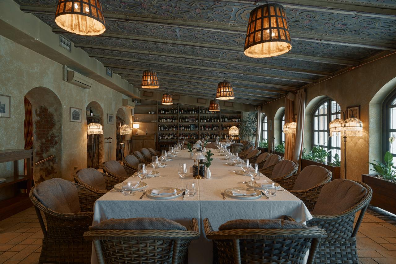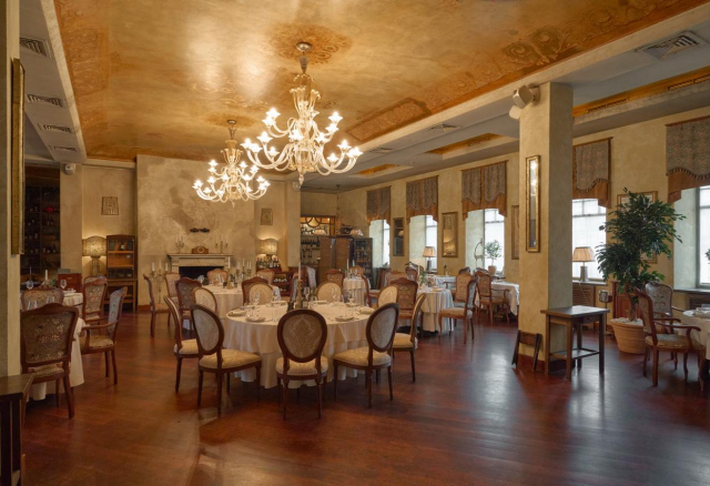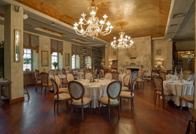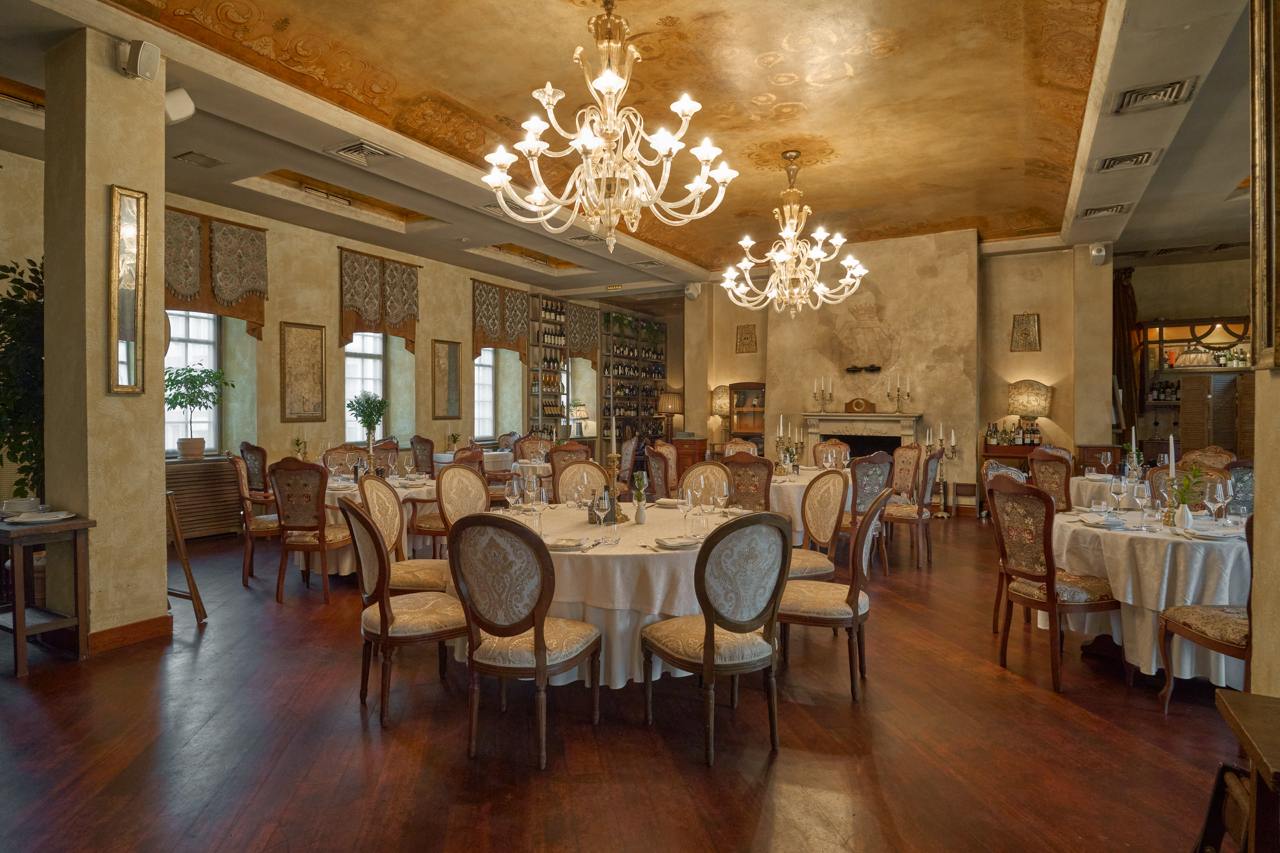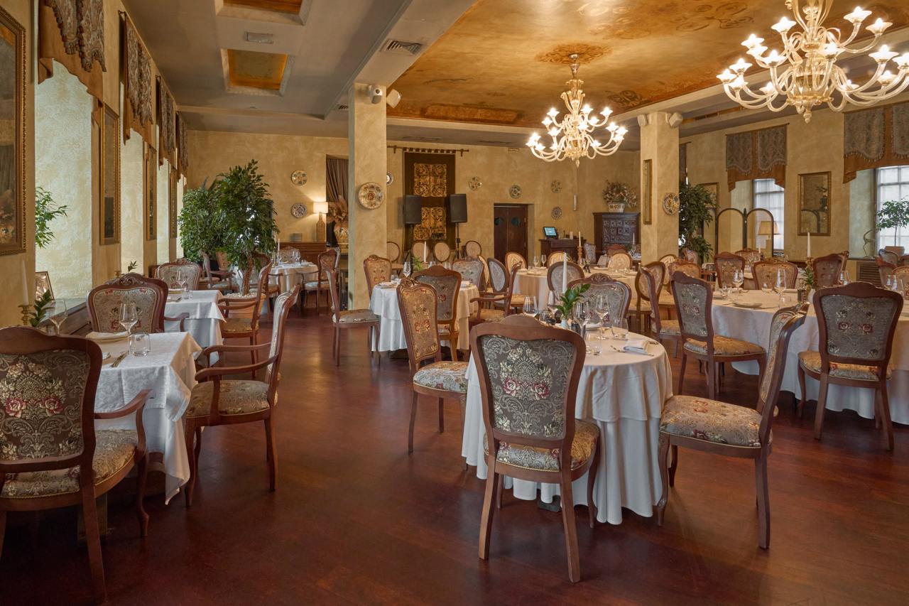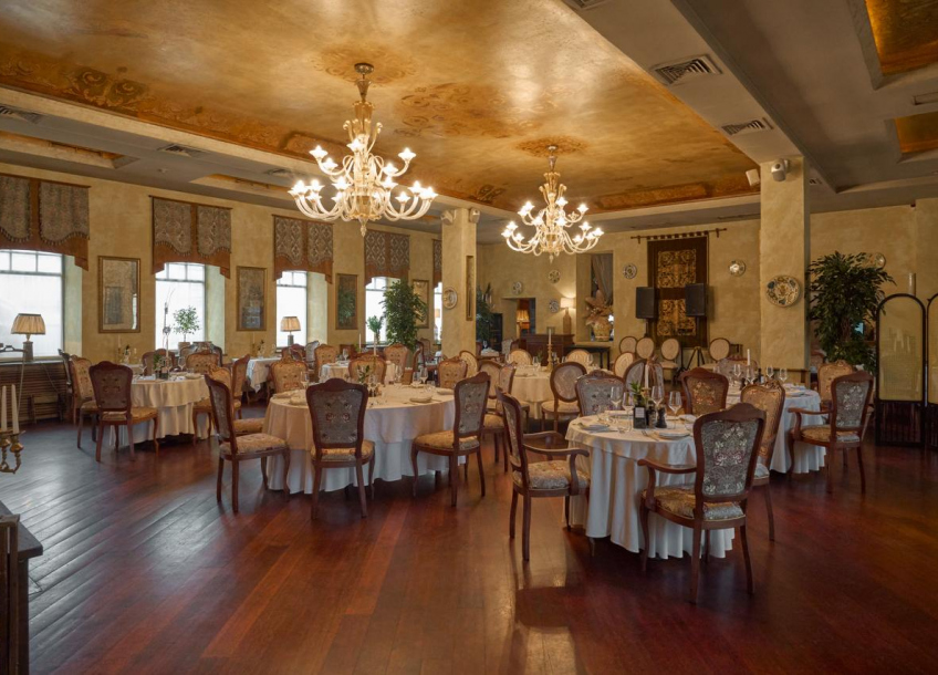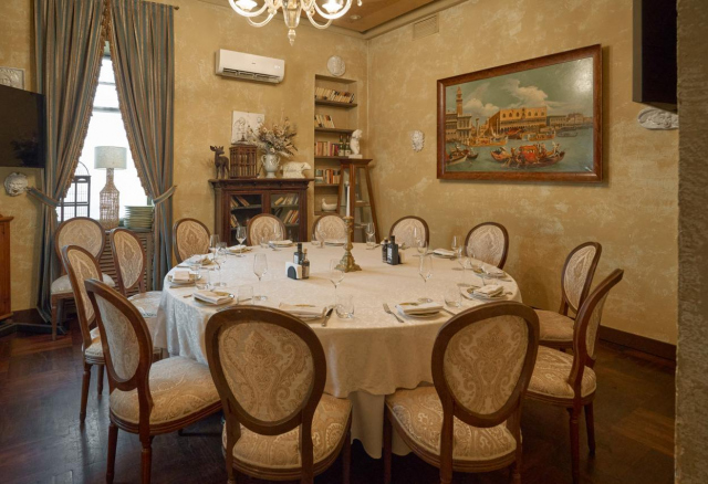 Пространство с высокими потолками, эффектными люстрами из муранского стекла, большими окнами, камином и сценой отлично подойдет для корпоративов, юбилеев и других семейных торжеств до 70 человек банкетом. Для мероприятий в узком кругу до 15 персон здесь предлагают уютную вип-комнату в венецианском стиле.