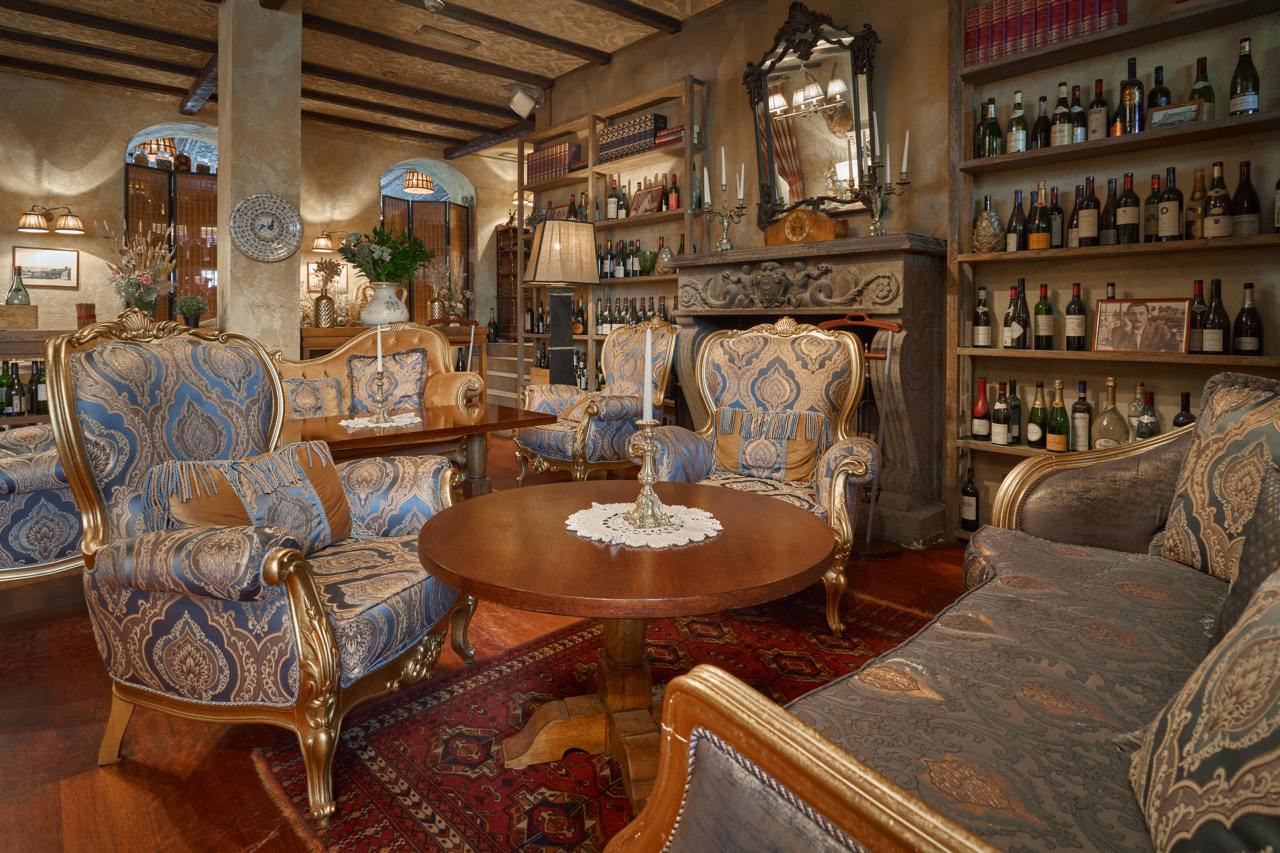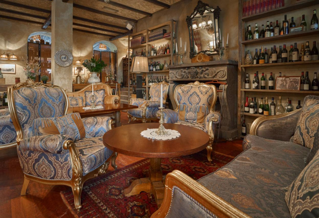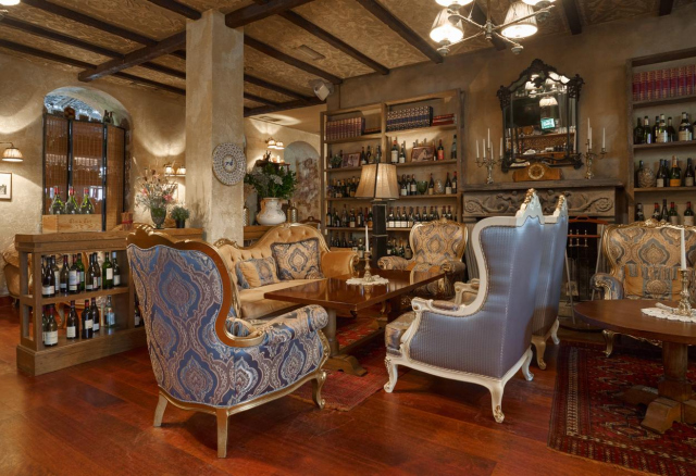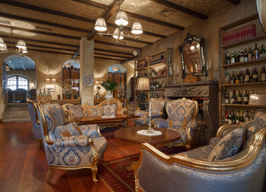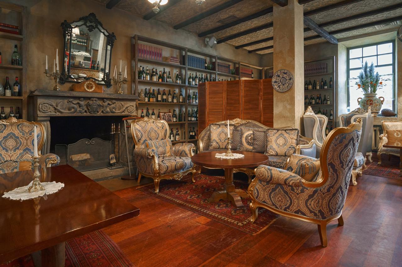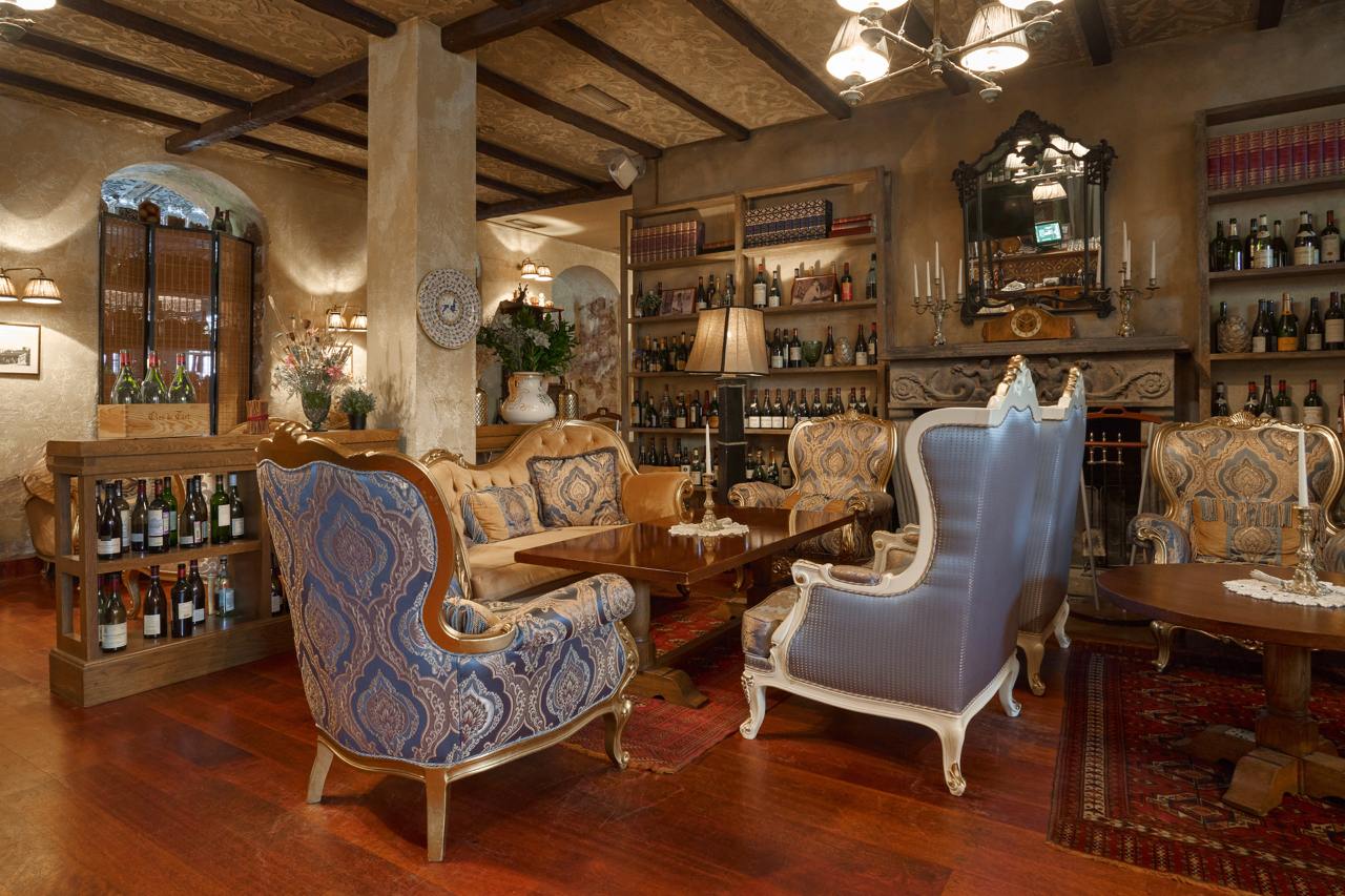Зал - «Энотека» с действующим камином и вычурными канделябрами, идеально подойдет для встречи небольшой компанией до 20 человек.