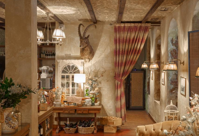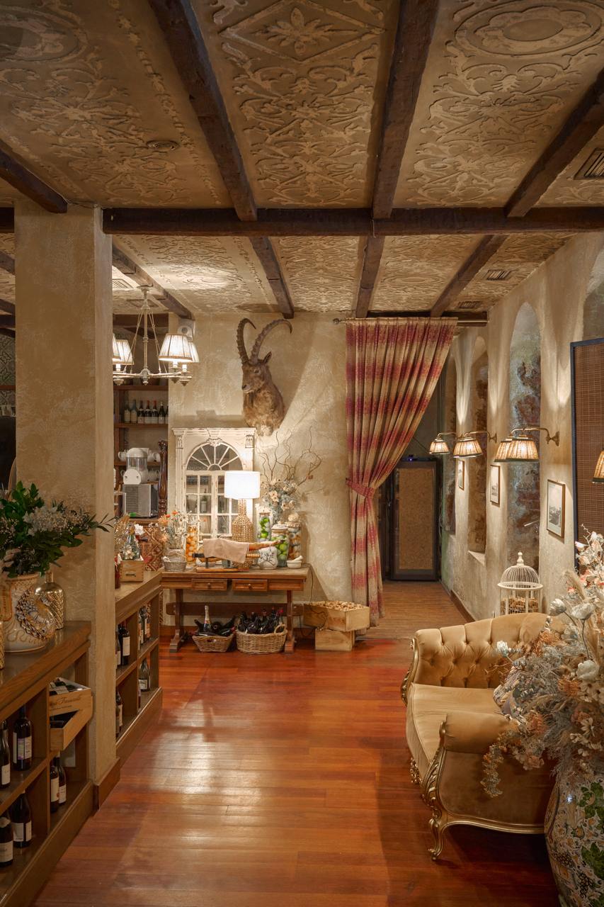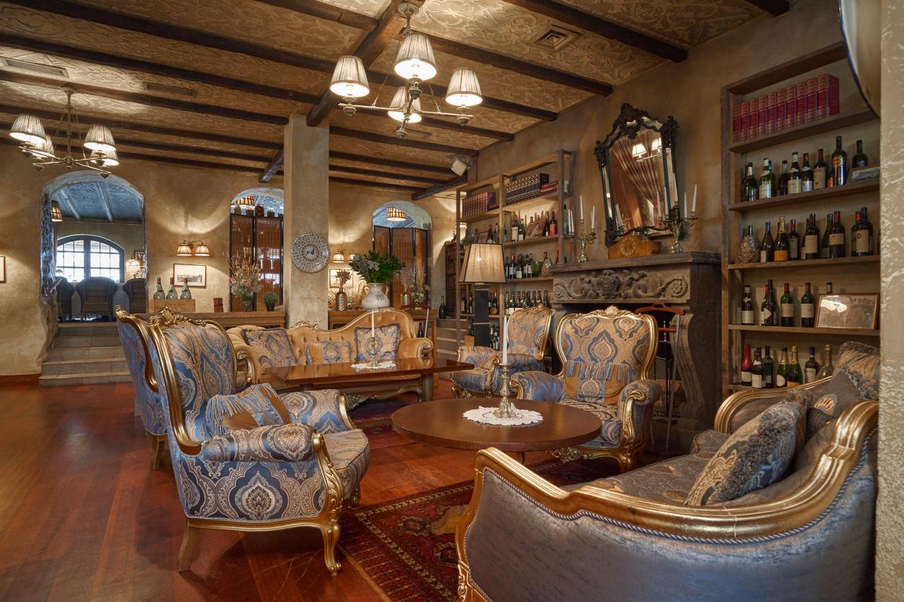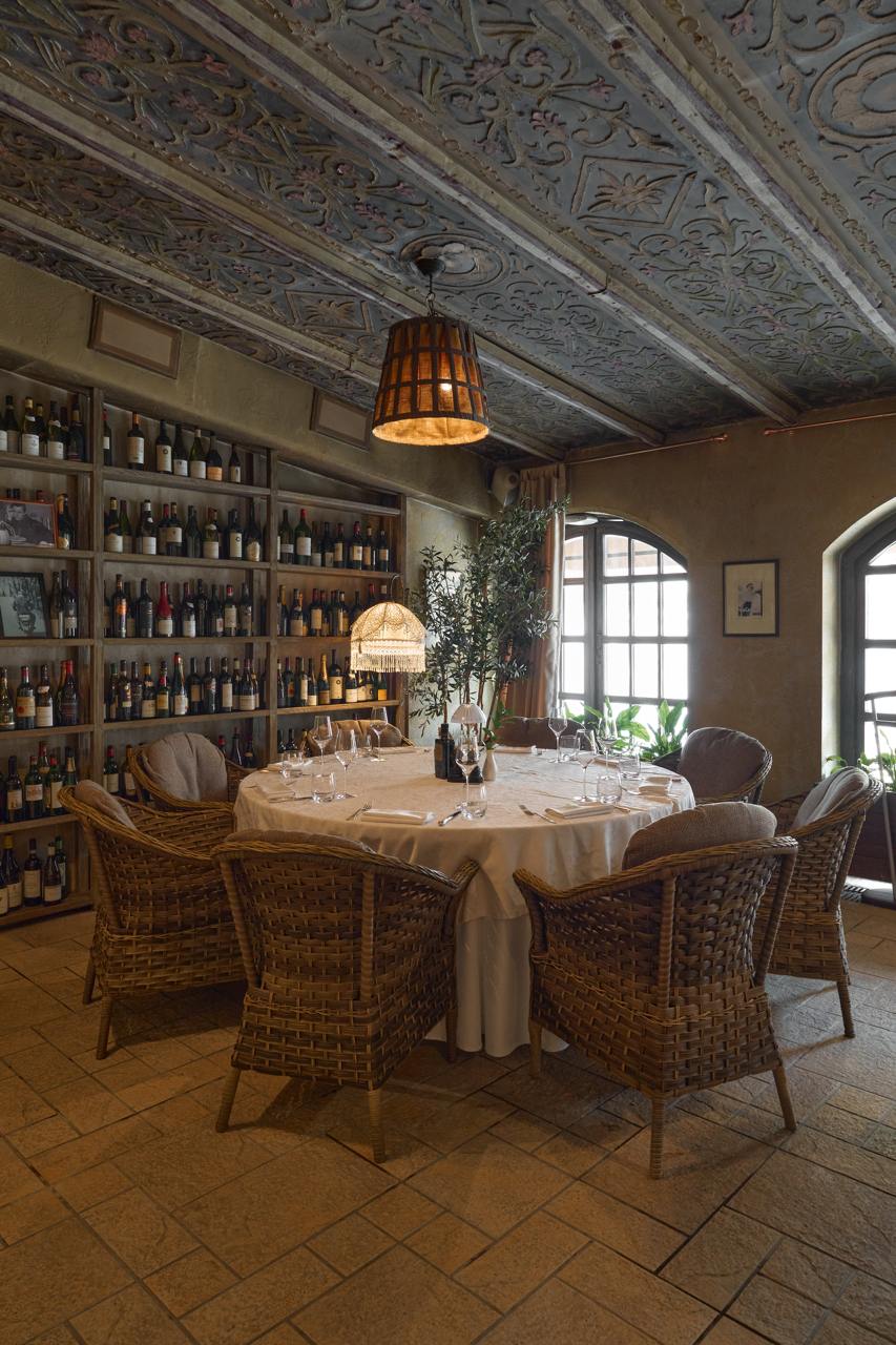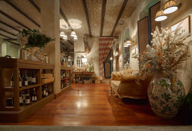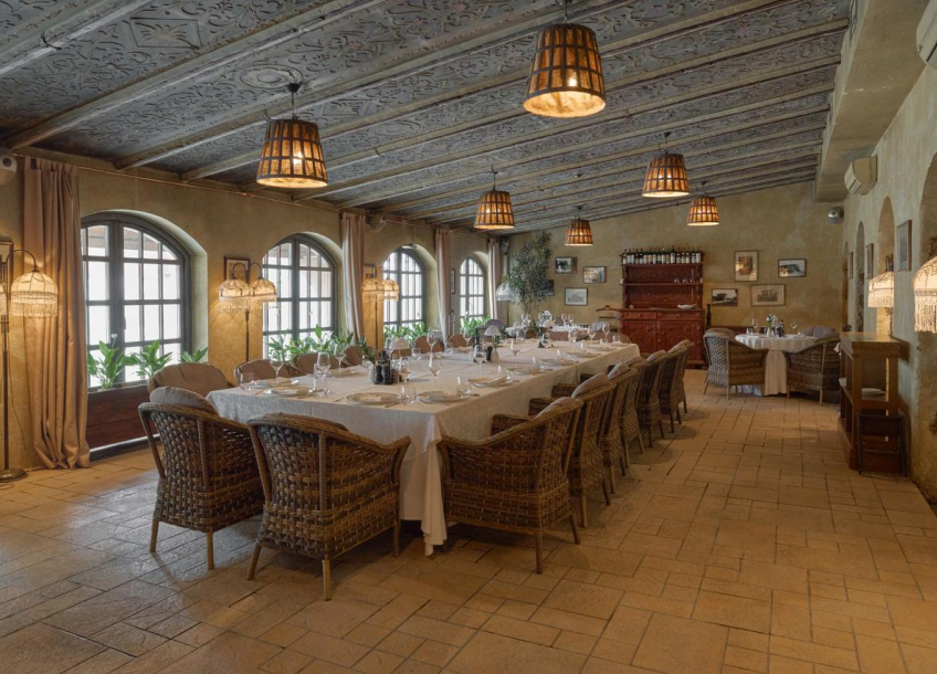Зал - «Энотека» с действующим камином и вычурными канделябрами, идеально подойдет для встречи небольшой компанией до 20 человек.