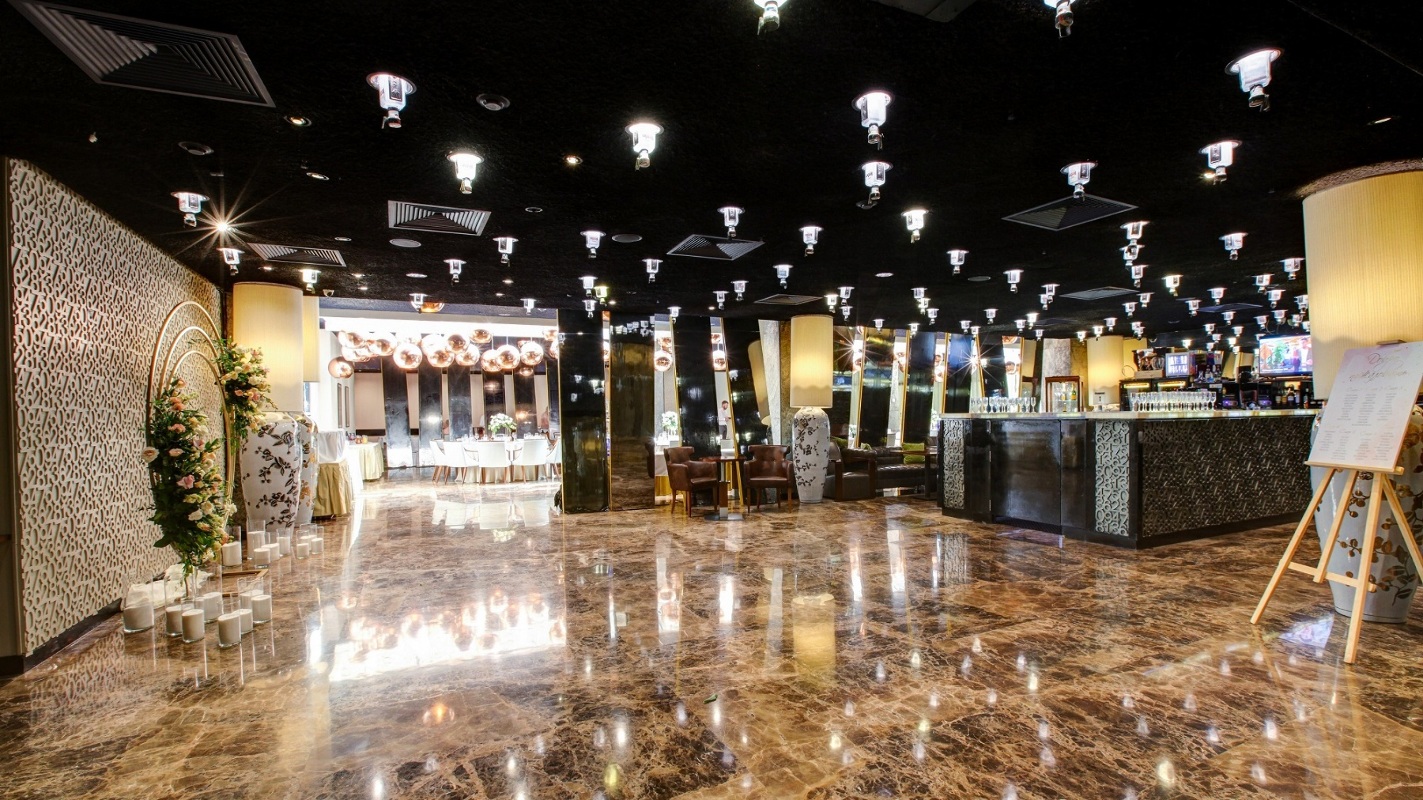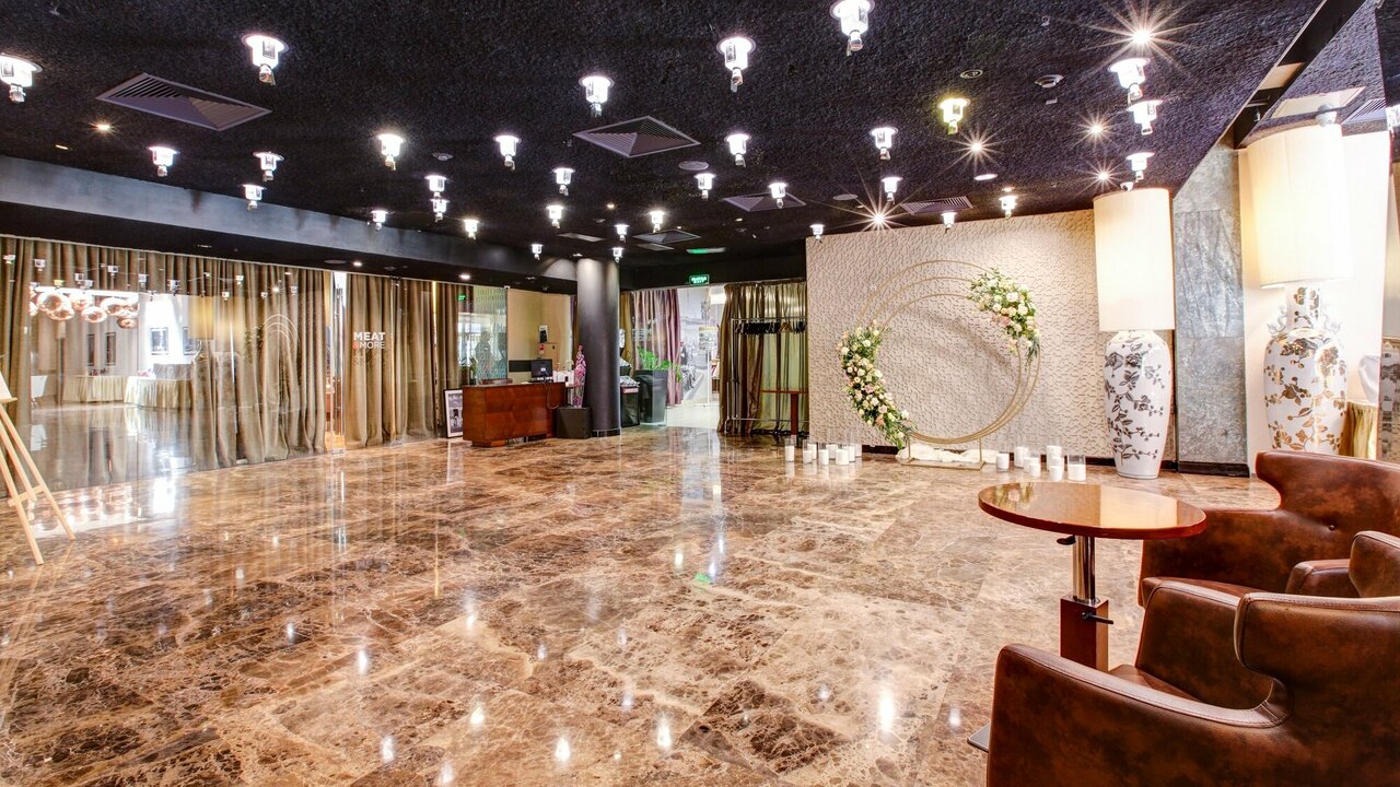 Изысканный стиль банкетного зала, расположенного в ресторане «MEAT&MORE» не оставит никого равнодушным. Для его проектирования был приглашен известный Питерский архитектор Антон Горланов. Пол в зале выложен многоцветной мраморной плиткой. Её основной тон — розового золота — перекликается с цветом многочисленных люстр-шаров. Площадь ресторана – 260 кв.м., Барная зона welcome – 80 кв.м.