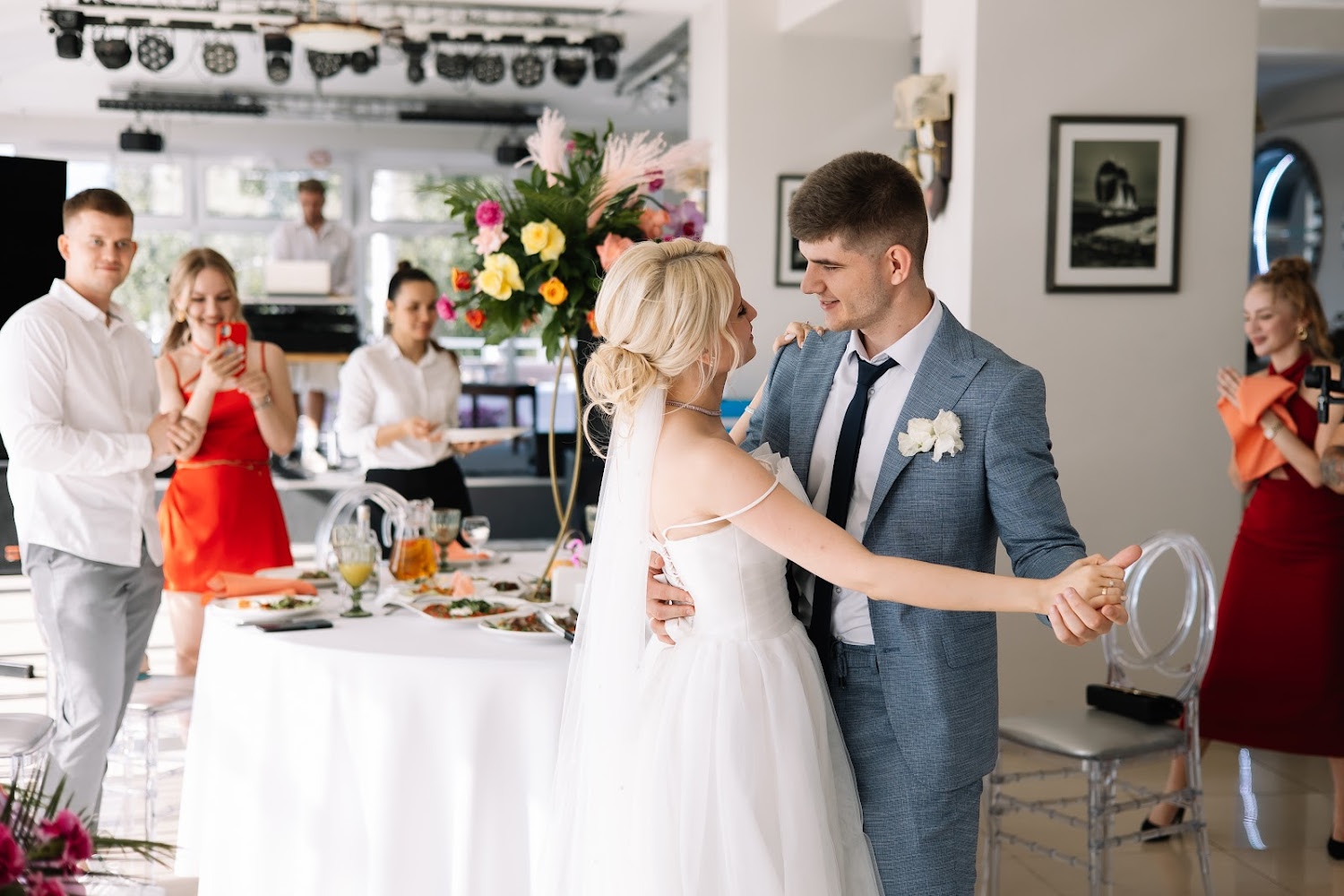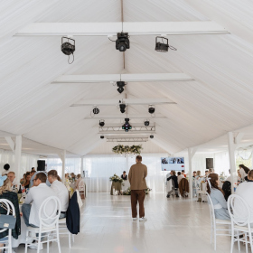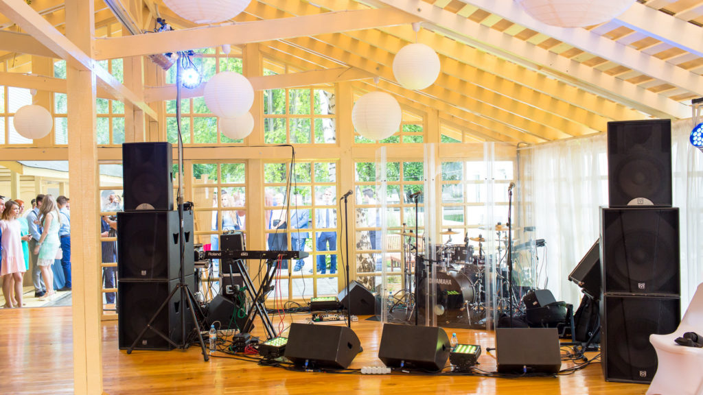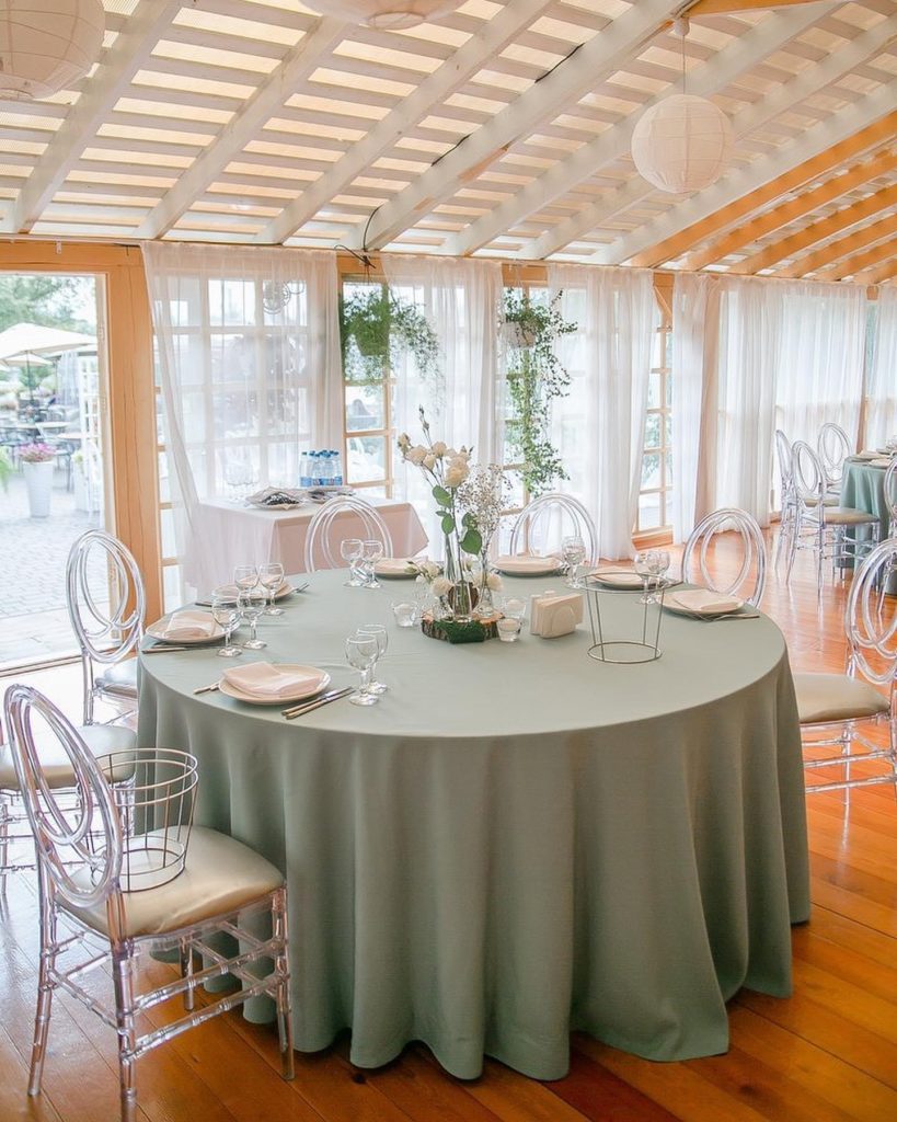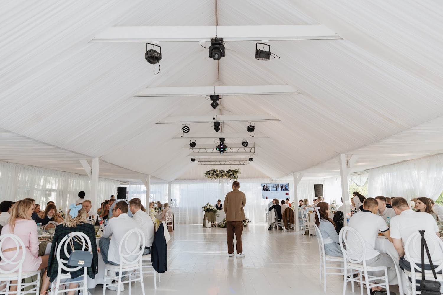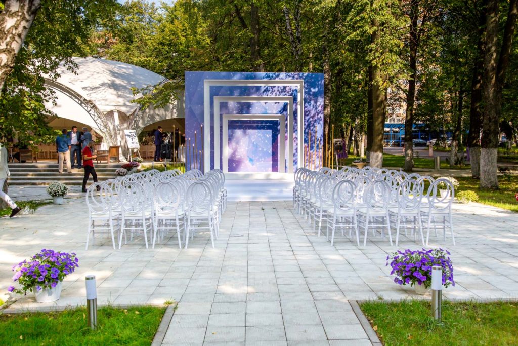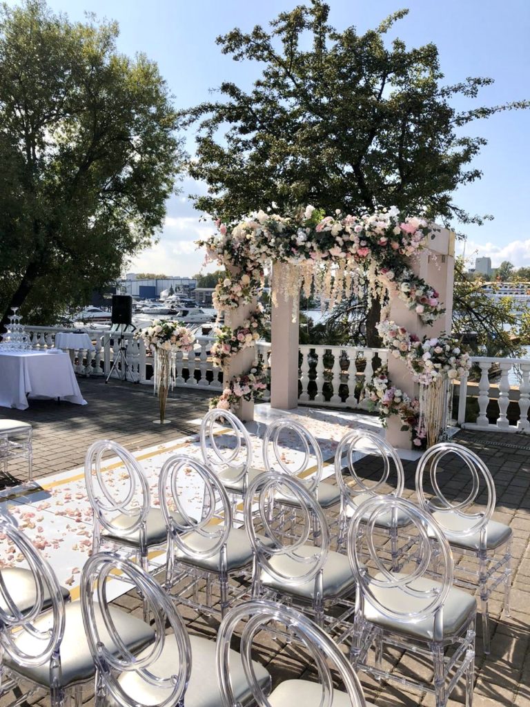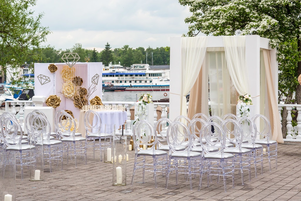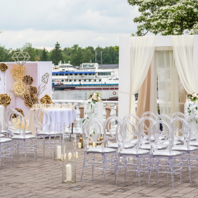 Аренда включает звуковое и светомузыкальное оборудование / мебель (стулья Phoenix белые или прозрачные) / текстиль (белые скатерти в пол и белые салфетки).