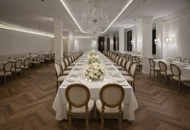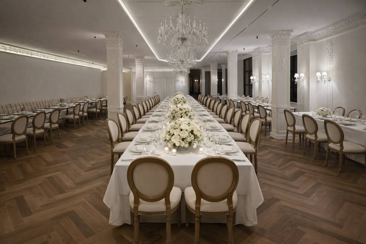 Первый этаж — камерный зал на 50 гостей, просторное зонированное пространство с элегантным интерьером и атмосферой, лестницей с подсветкой, ведущей на второй уровень.