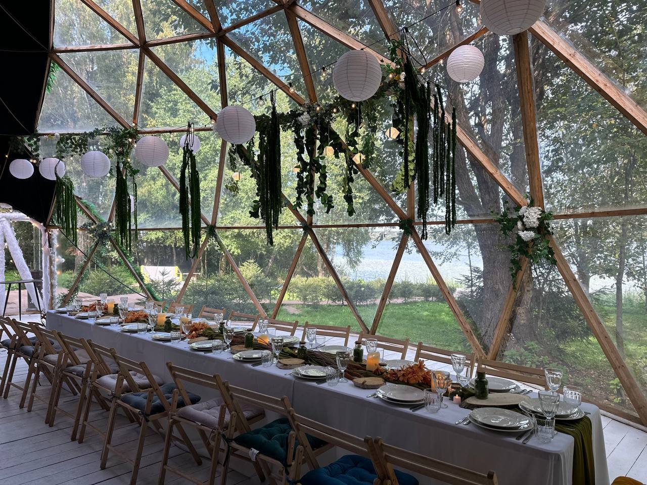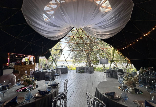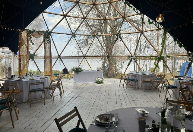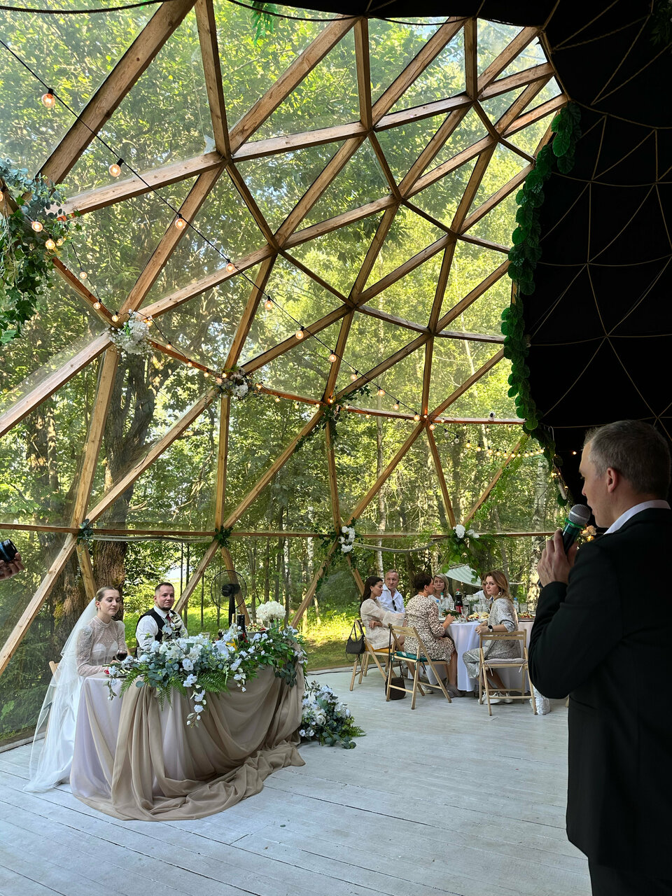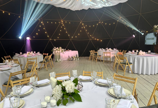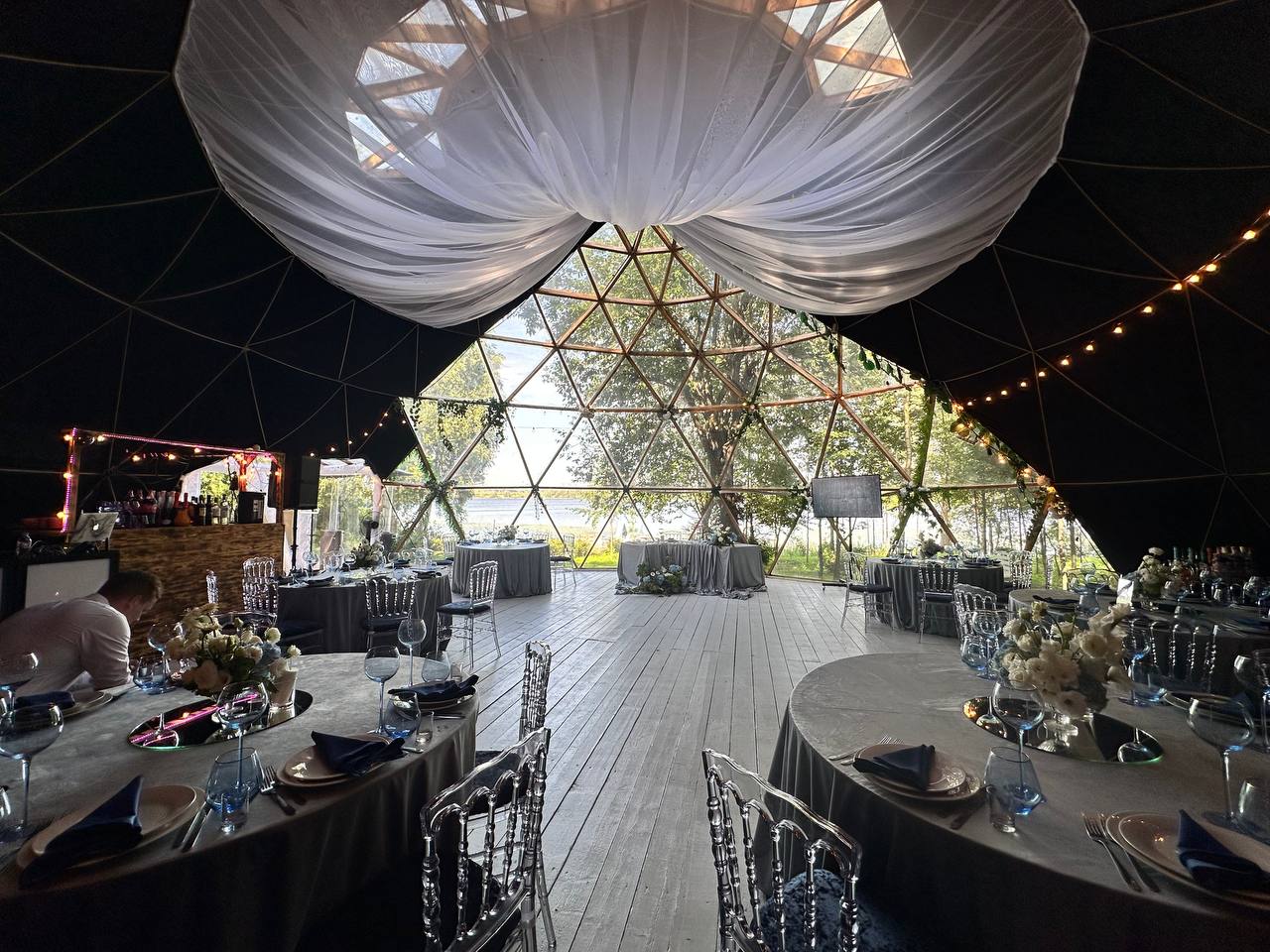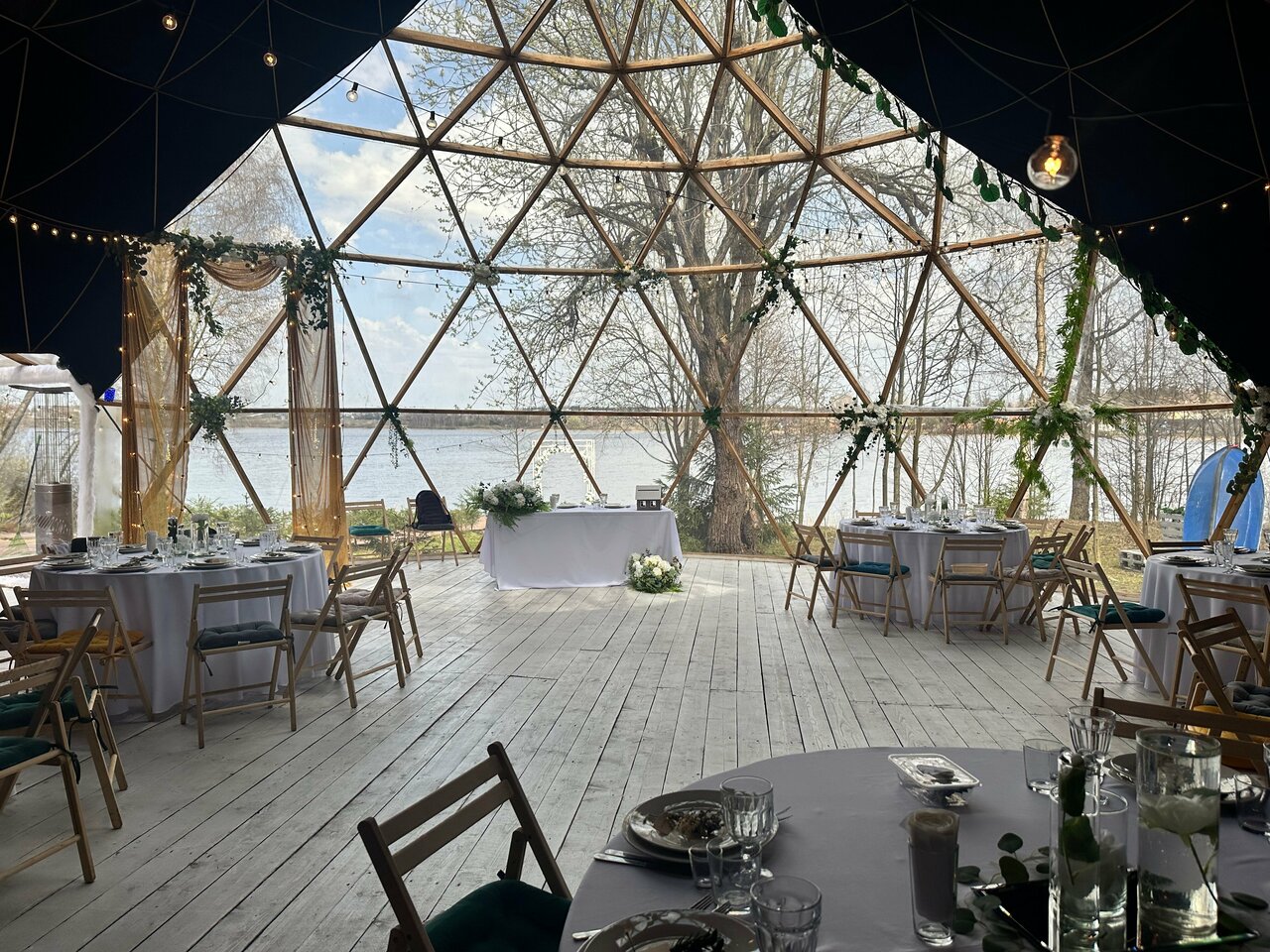 Большой арочный шатер высотой 6 м. на берегу красивого лесного озера с огромной обустроенной прилегающей территорией. Идеально подходит для торжественных мероприятий. Аренда возможна в любое время года — при необходимости будет установлено климатическое оборудование, чтобы сделать температуру под куполом комфортной и спасти от изнуряющей жары и солнца или от мороза и снега.