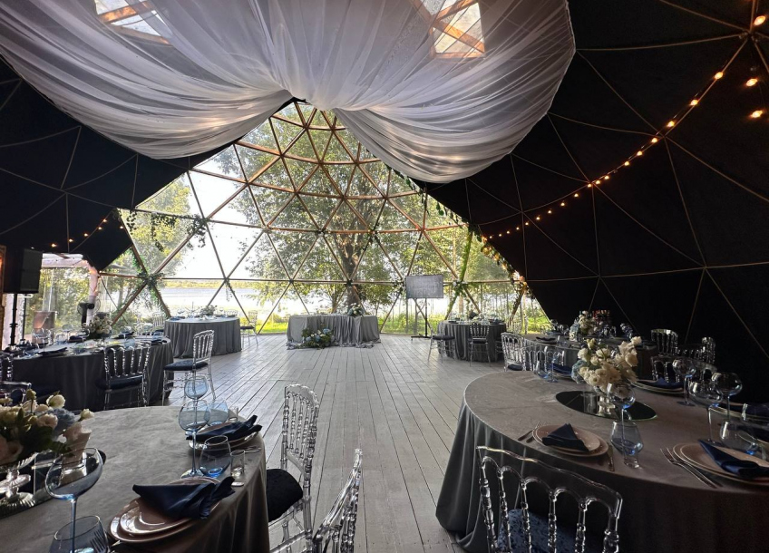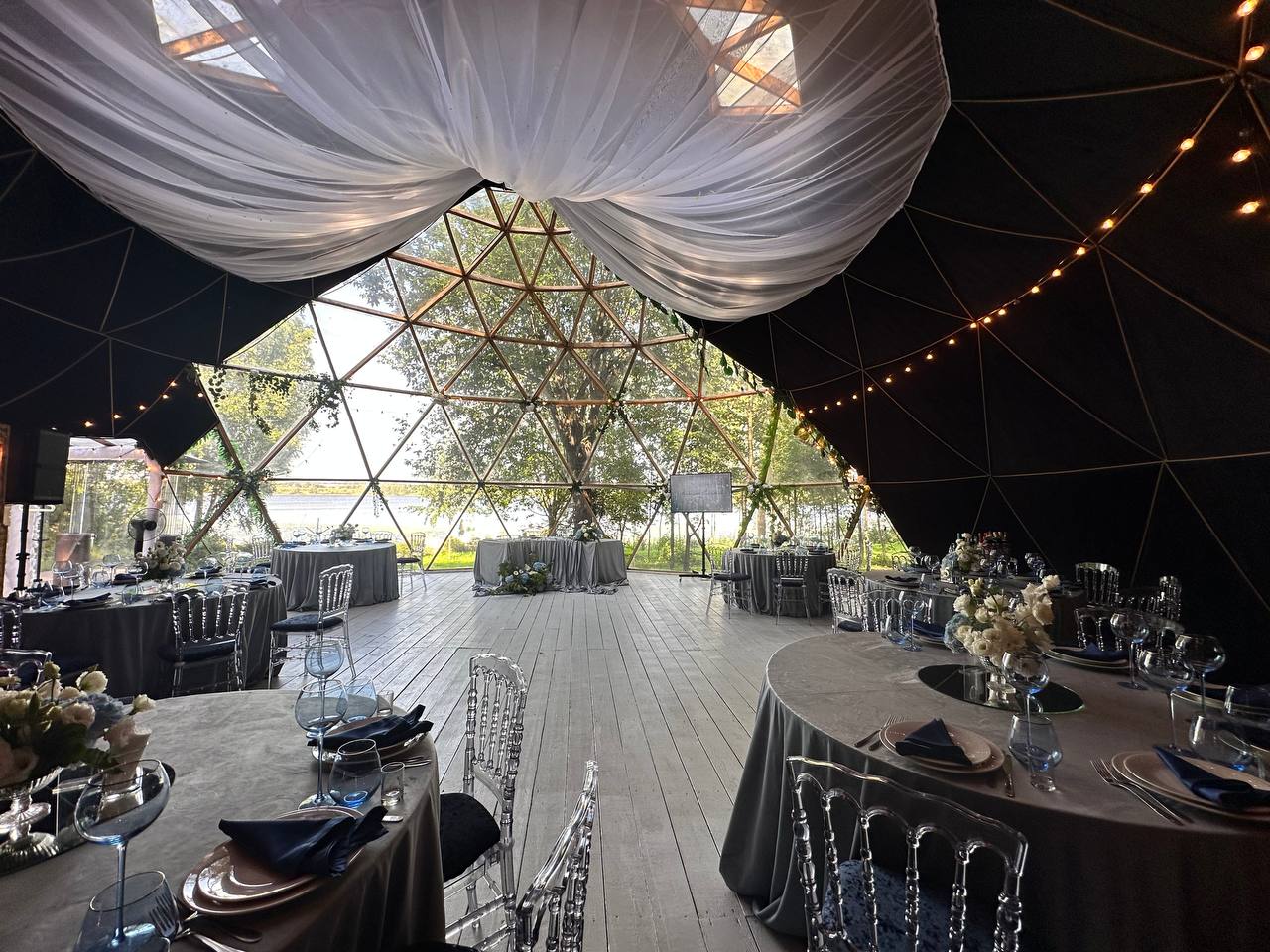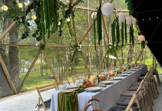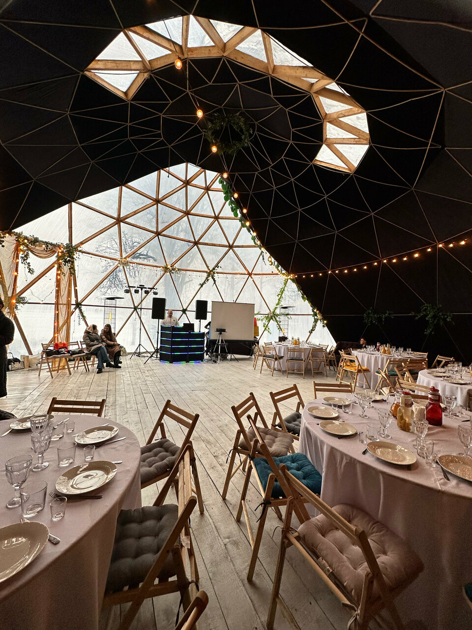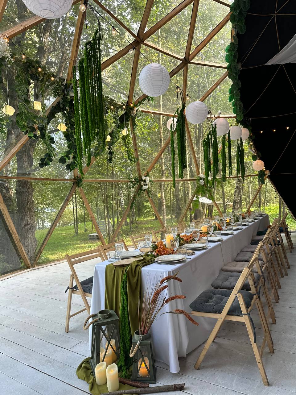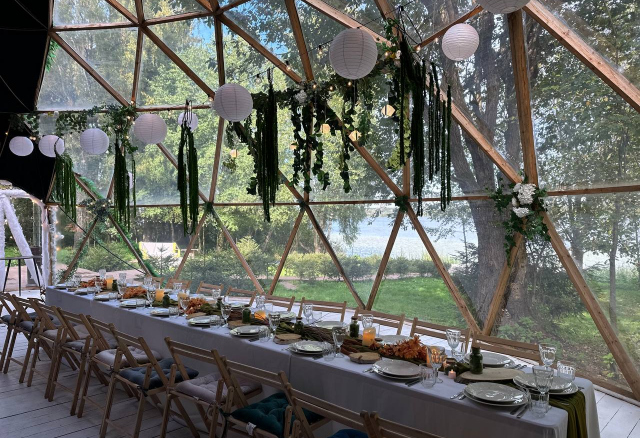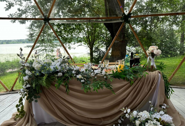 Большой арочный шатер высотой 6 м. на берегу красивого лесного озера с огромной обустроенной прилегающей территорией. Идеально подходит для торжественных мероприятий. Аренда возможна в любое время года — при необходимости будет установлено климатическое оборудование, чтобы сделать температуру под куполом комфортной и спасти от изнуряющей жары и солнца или от мороза и снега.