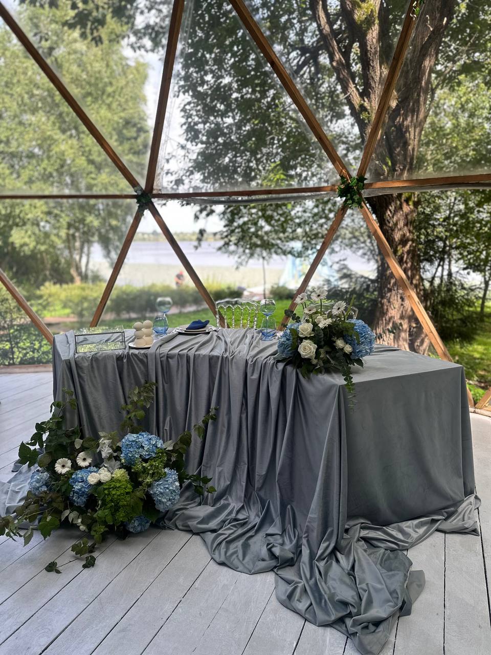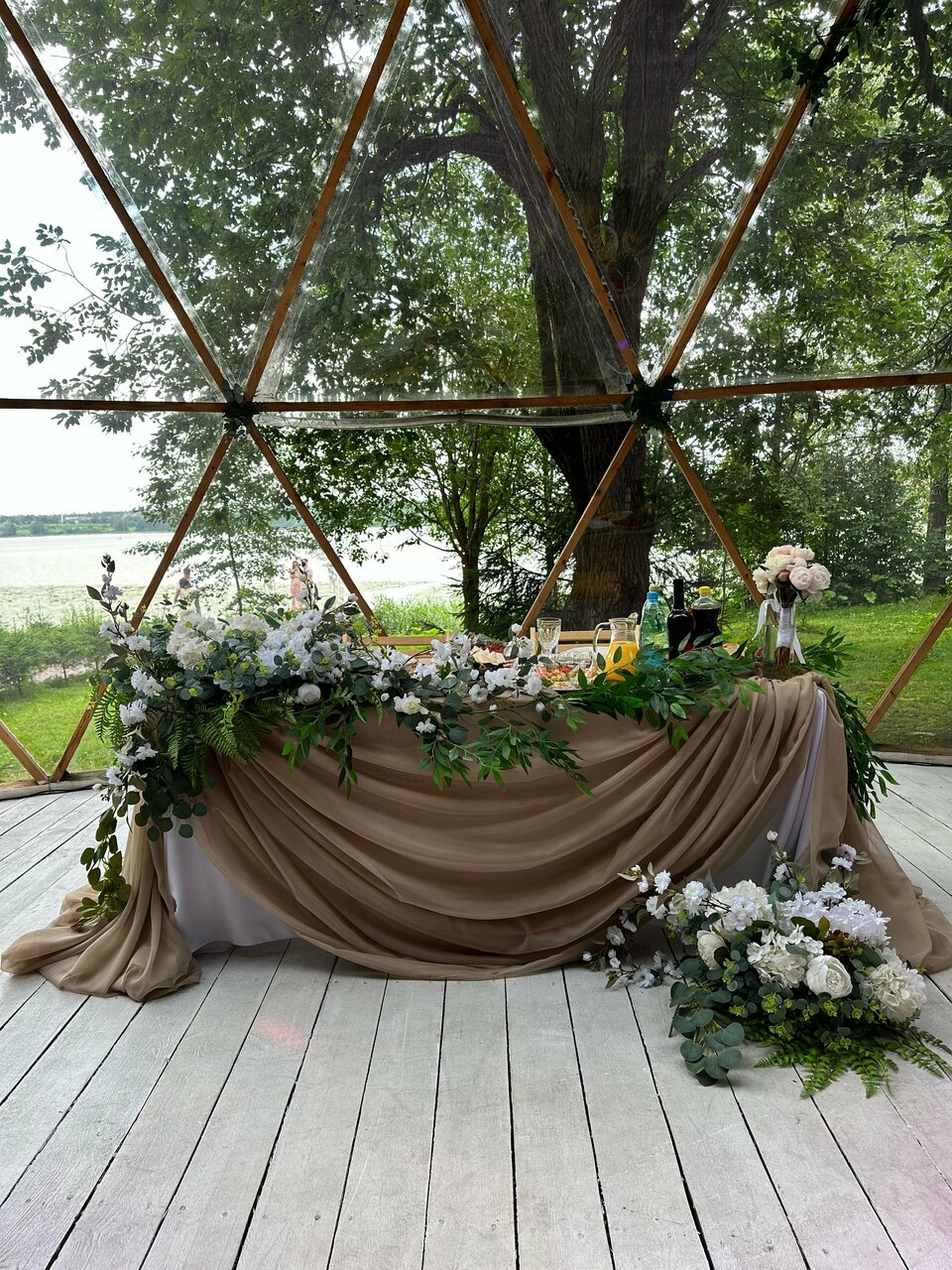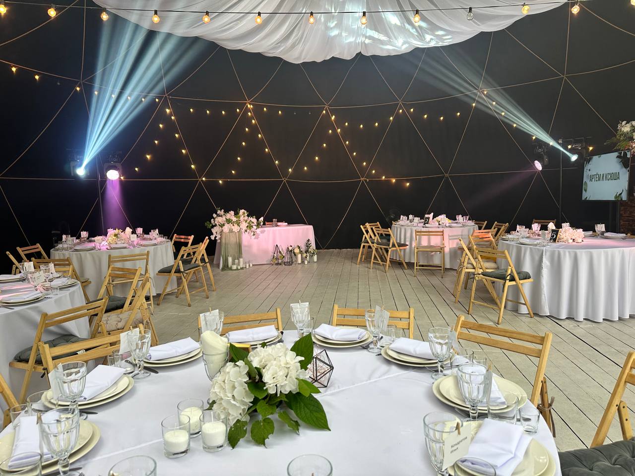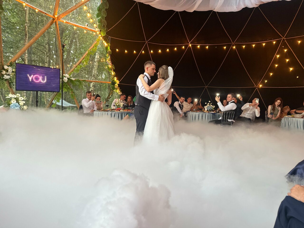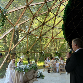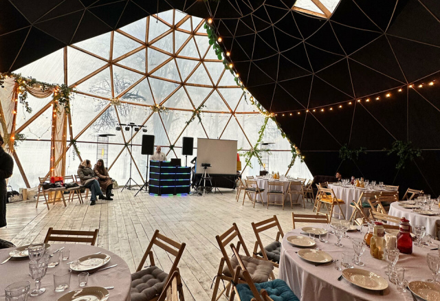 Большой арочный шатер высотой 6 м. на берегу красивого лесного озера с огромной обустроенной прилегающей территорией. Идеально подходит для торжественных мероприятий. Аренда возможна в любое время года — при необходимости будет установлено климатическое оборудование, чтобы сделать температуру под куполом комфортной и спасти от изнуряющей жары и солнца или от мороза и снега.