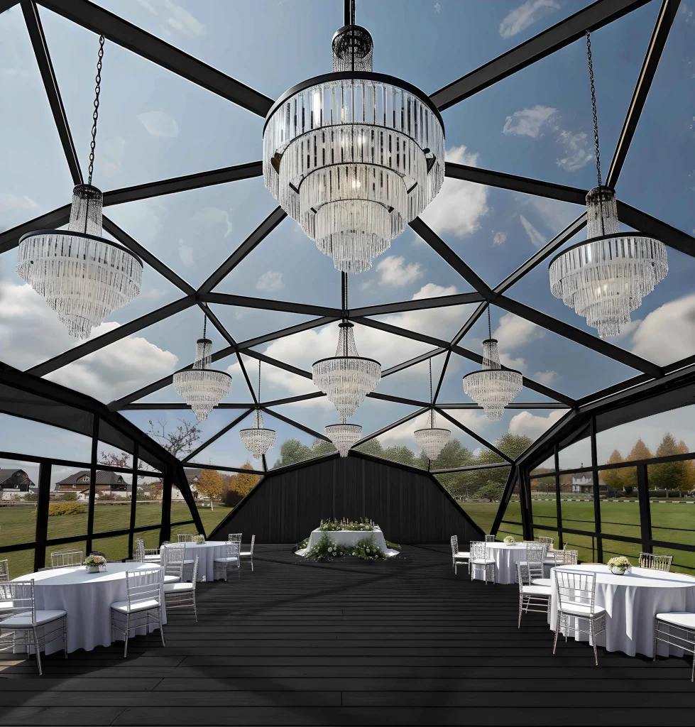 - Все шатры уже драпированы тканью и украшены ретро лампочками, что существенно сократит бюджет на декор. Мебель и текстиль входят в стоимость, стулья кьявари.