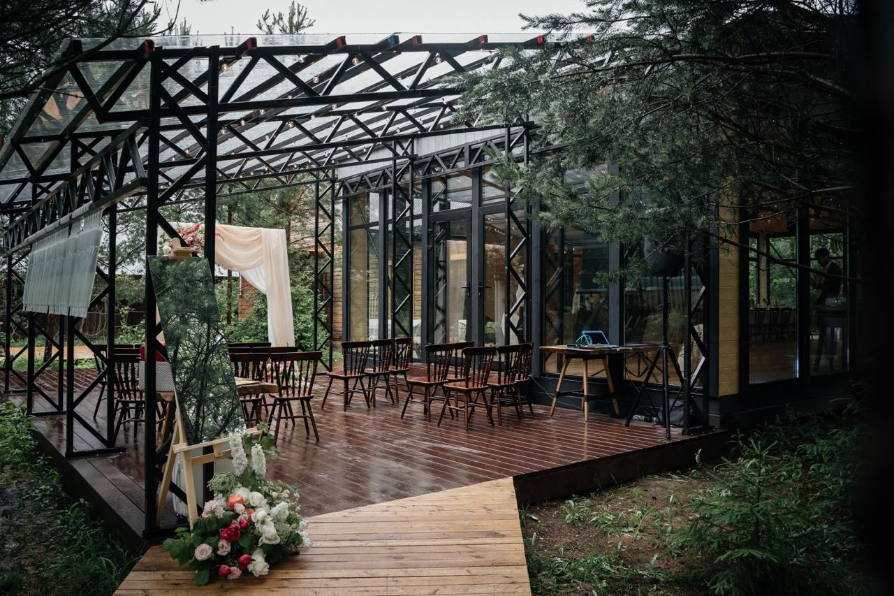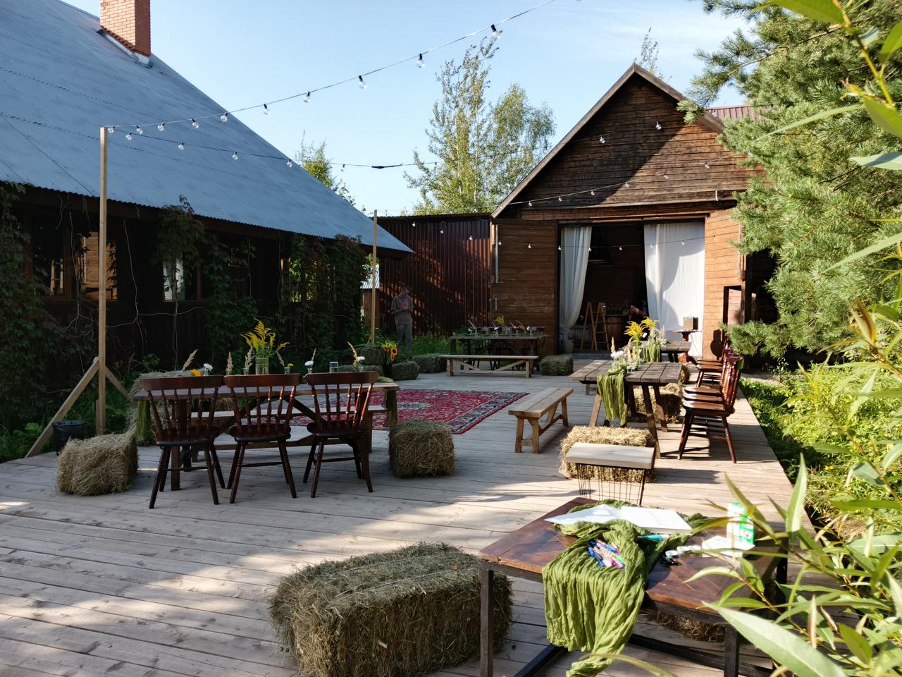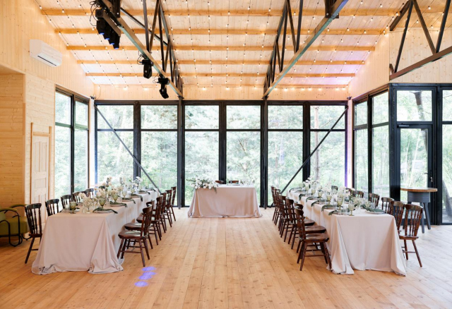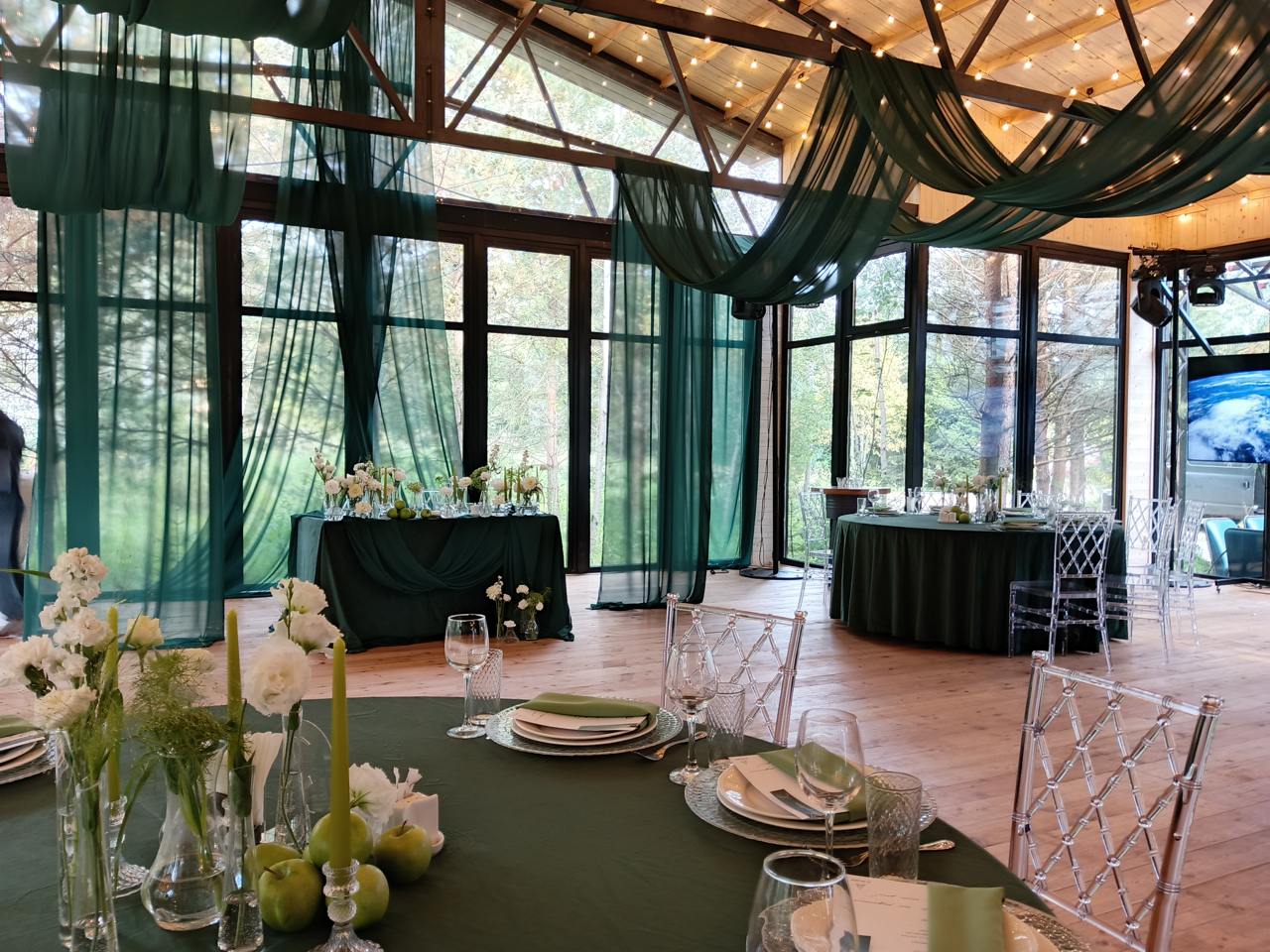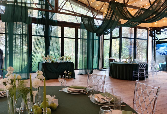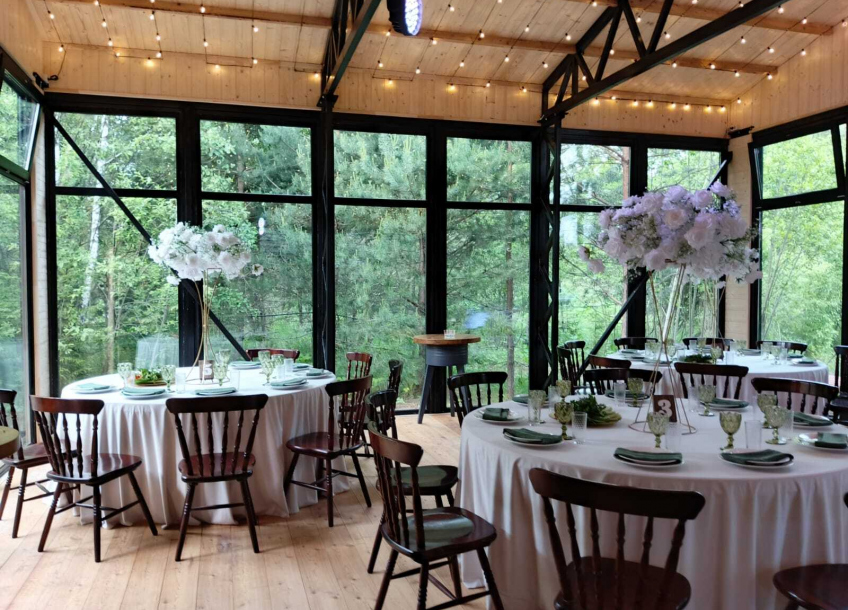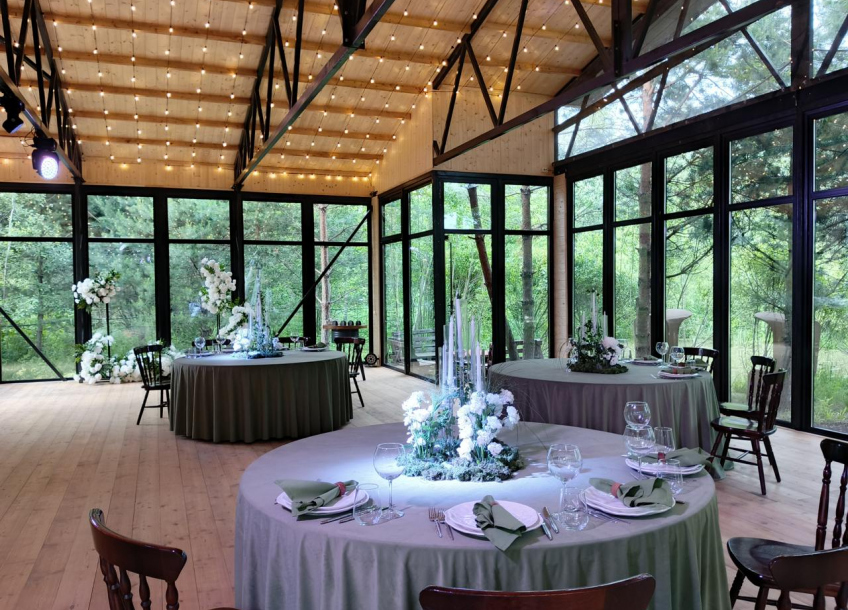 - банкетный зал состоит из 2-х частей - амбар (75 кв.м) и застекленная, утепленная веранда 150 кв.м. + крытая и открытая террасы