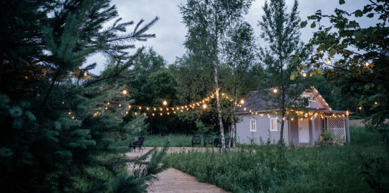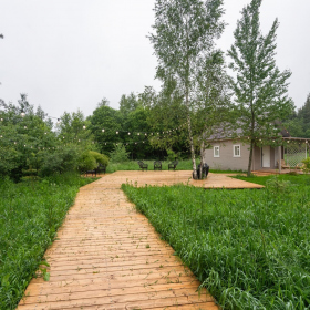 - лес, пруд c пирсом, небольшое поле, костровая зона