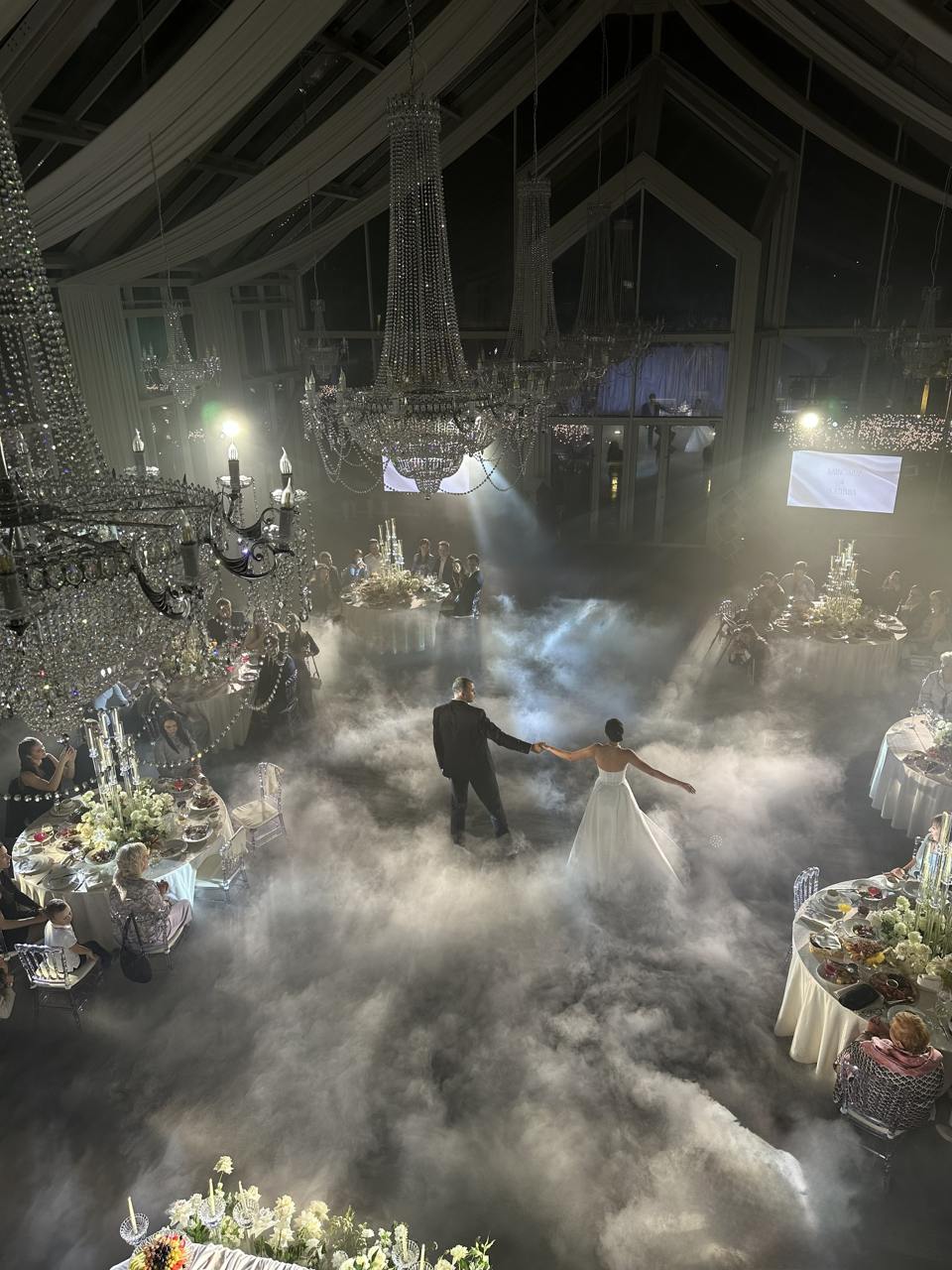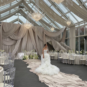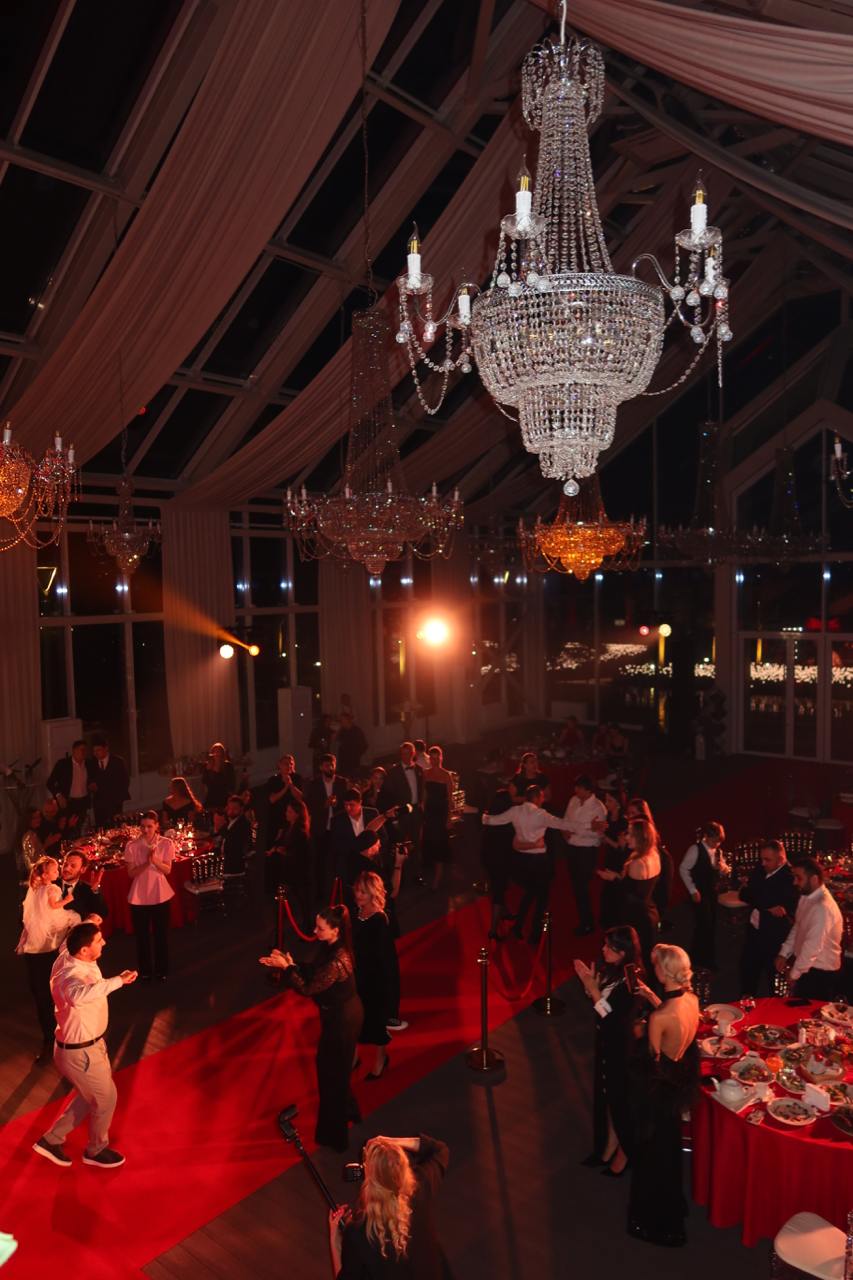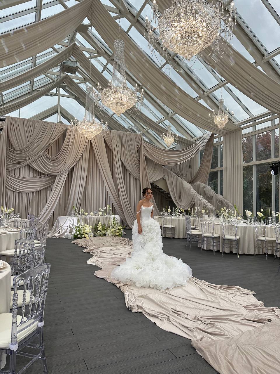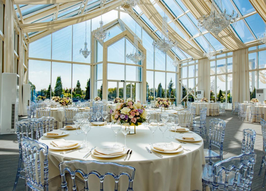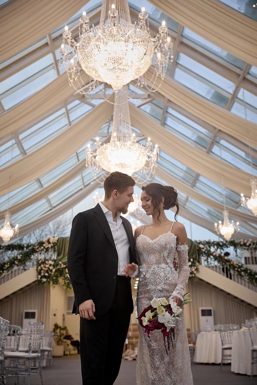 - панорамная веранда с потолками 12 метров, классическими люстрами и драпировкой на потолке