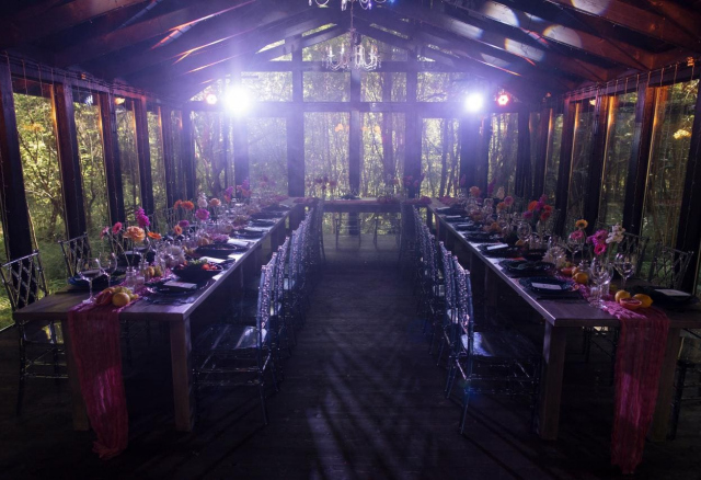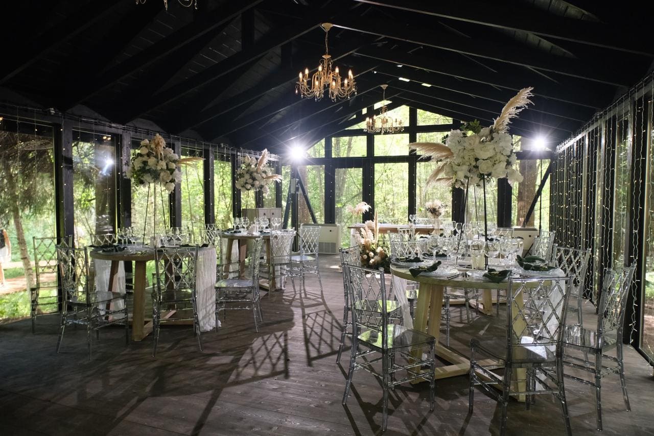 Для банкета предусмотрена стильная деревянная веранда в окружении вековых елей. По вашему желанию гости могут расположиться за круглыми или прямоугольными столами. Недалеко от площадки расположен современный Gleм, в нем могут комфортно остаться на ночь до 14 гостей.