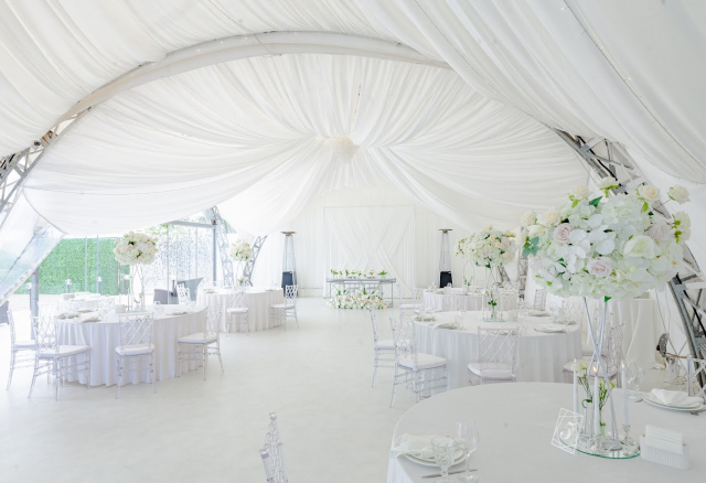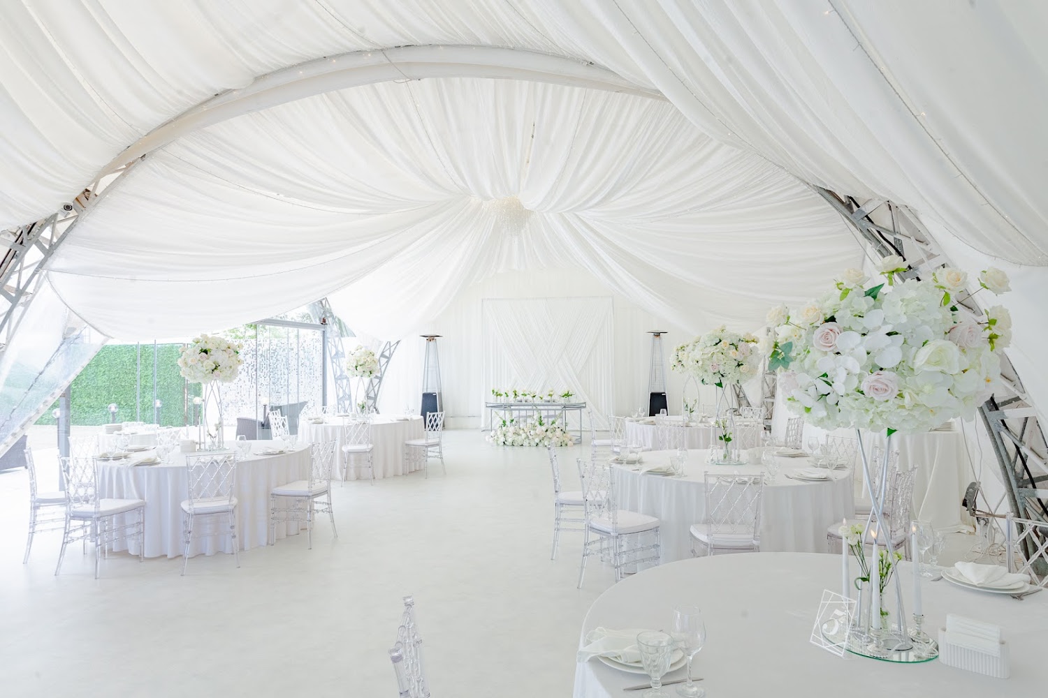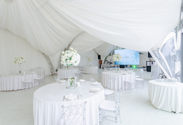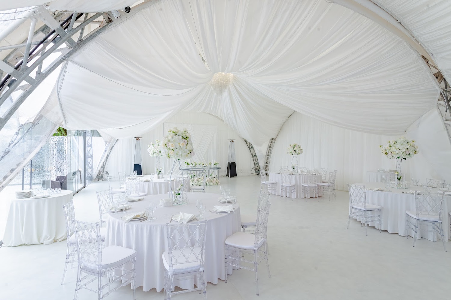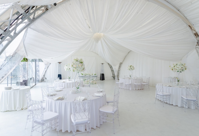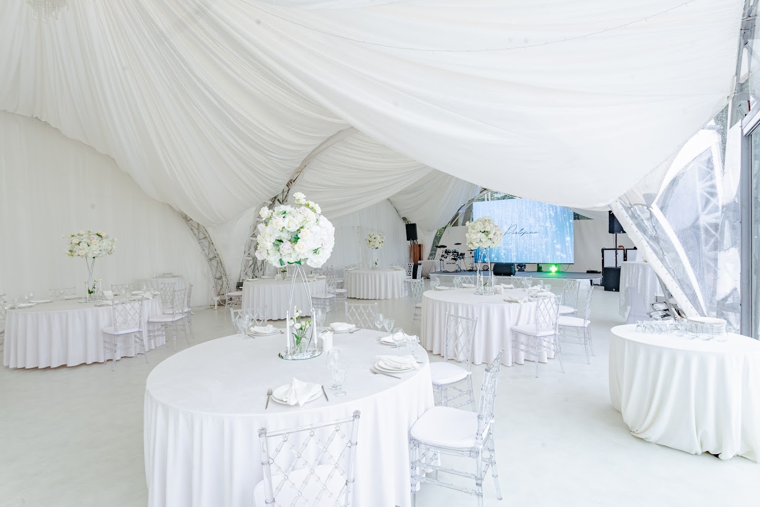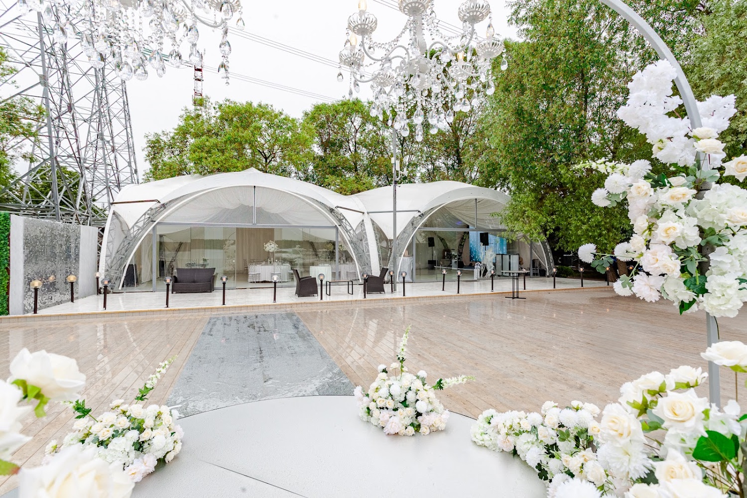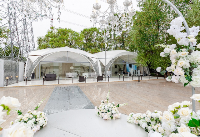 Белоснежный красивый новый шатер расположен в Подмосковье всего в 10 км от Москвы. Размер свадебной площадки составляет 200 м2 и спокойно вмещает до 100 гостей банкетной рассадки. Из зала открывается фантастическая панорама на воду и яхты. Застекленный шатер защищает от ветра и дождливой погоды, а безрамное раздвижное остекление придает площадке стиль и уникальность. При теплой и солнечной погоде стекла полностью раздвигаются, что дает возможность наслаждаться красотами природы!