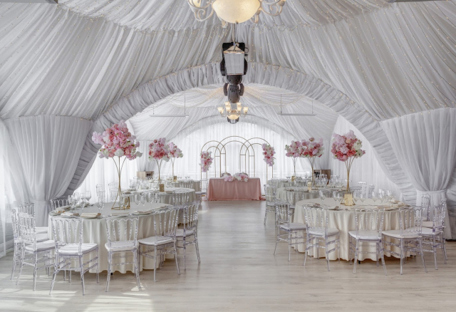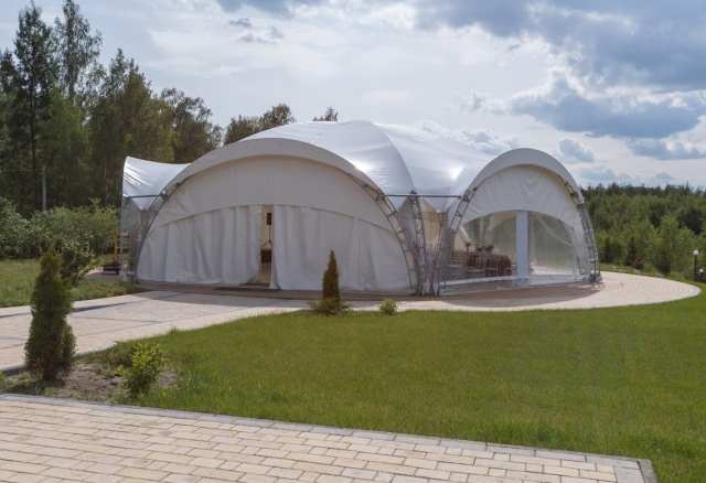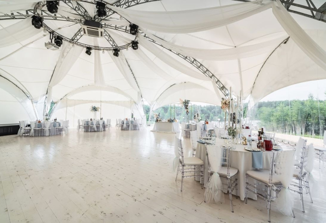 Панорамный шатер Вместимость 70 Средний чек 6 500 ₽ Стоимость аренды 30 000 – 60 000 ₽ Депозит на банкет 180 000 – 250 000 ₽